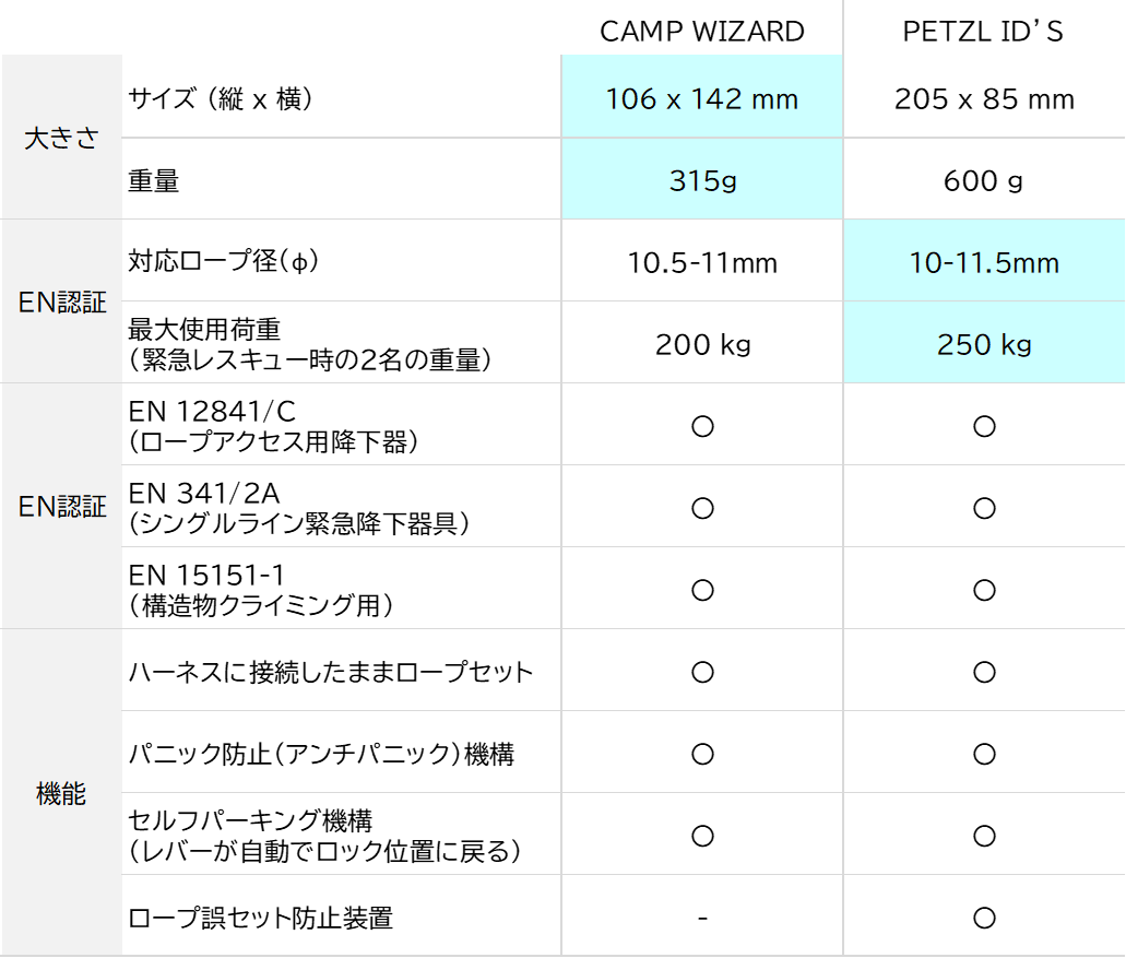 参考として、下降器のベストセラーモデル「ペツル アイディS」との比較を以下に記載します。