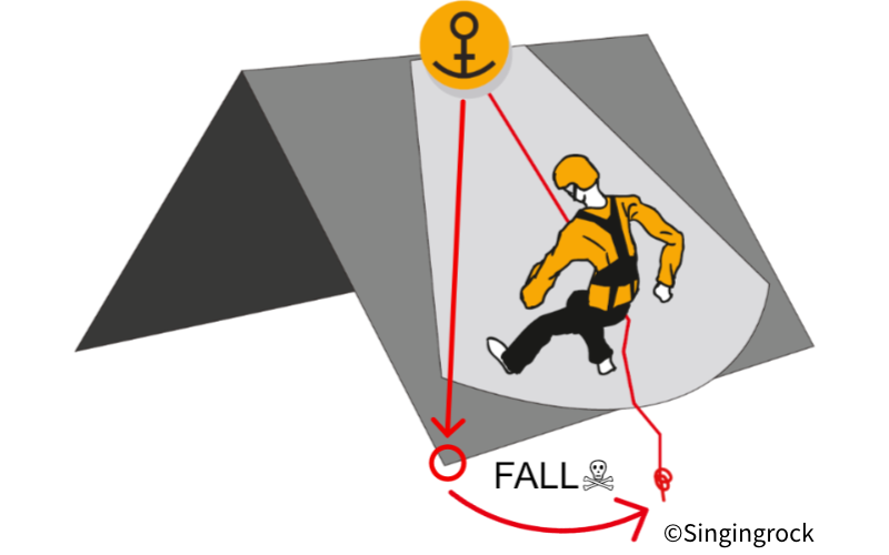 もし、赤い〇の位置まで作業者がランヤードを伸ばして移動し、万一足を滑らせてしまうと、支点の真下の位置にまで振り子のように戻され、ランヤードを余計に伸ばした分だけ屋根から落下してしまいます。
