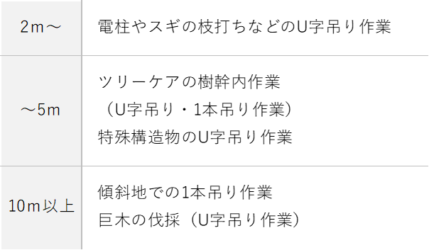 おもにチェーンソーを使用するツリーケアで利用されますが、ワークポジショニングの姿勢で金属カッターを使用するような仕事でも利用されます。