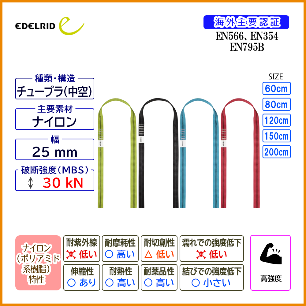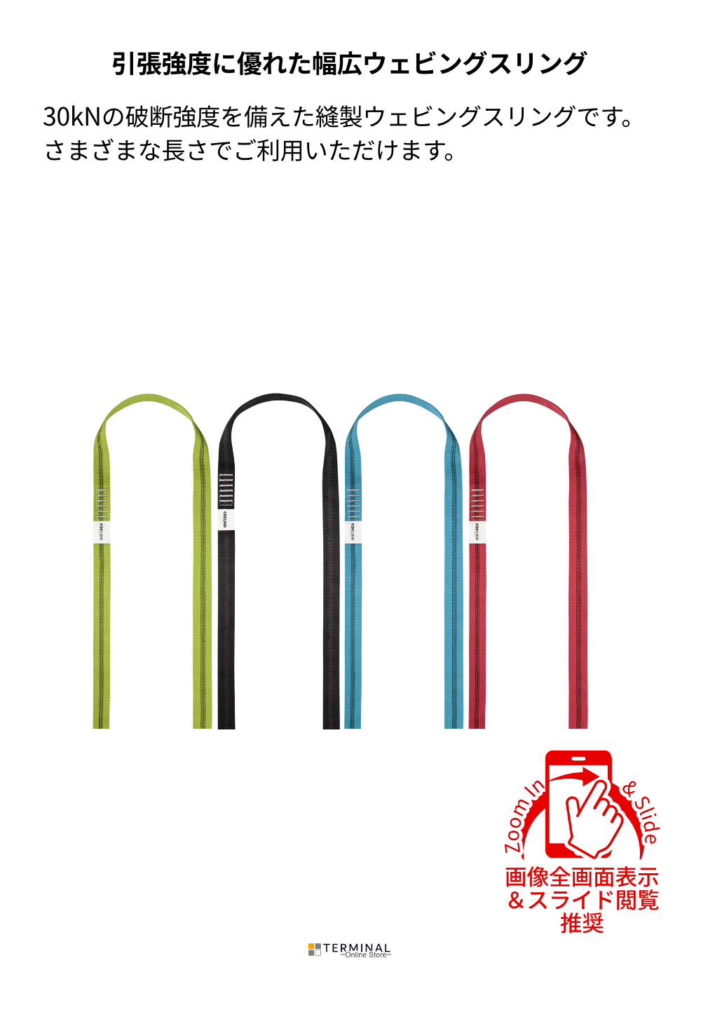 幅 25 mm、驚異的な破断強度 30 kN の縫製ウェビング スリング。さまざまな長さをご用意しています。