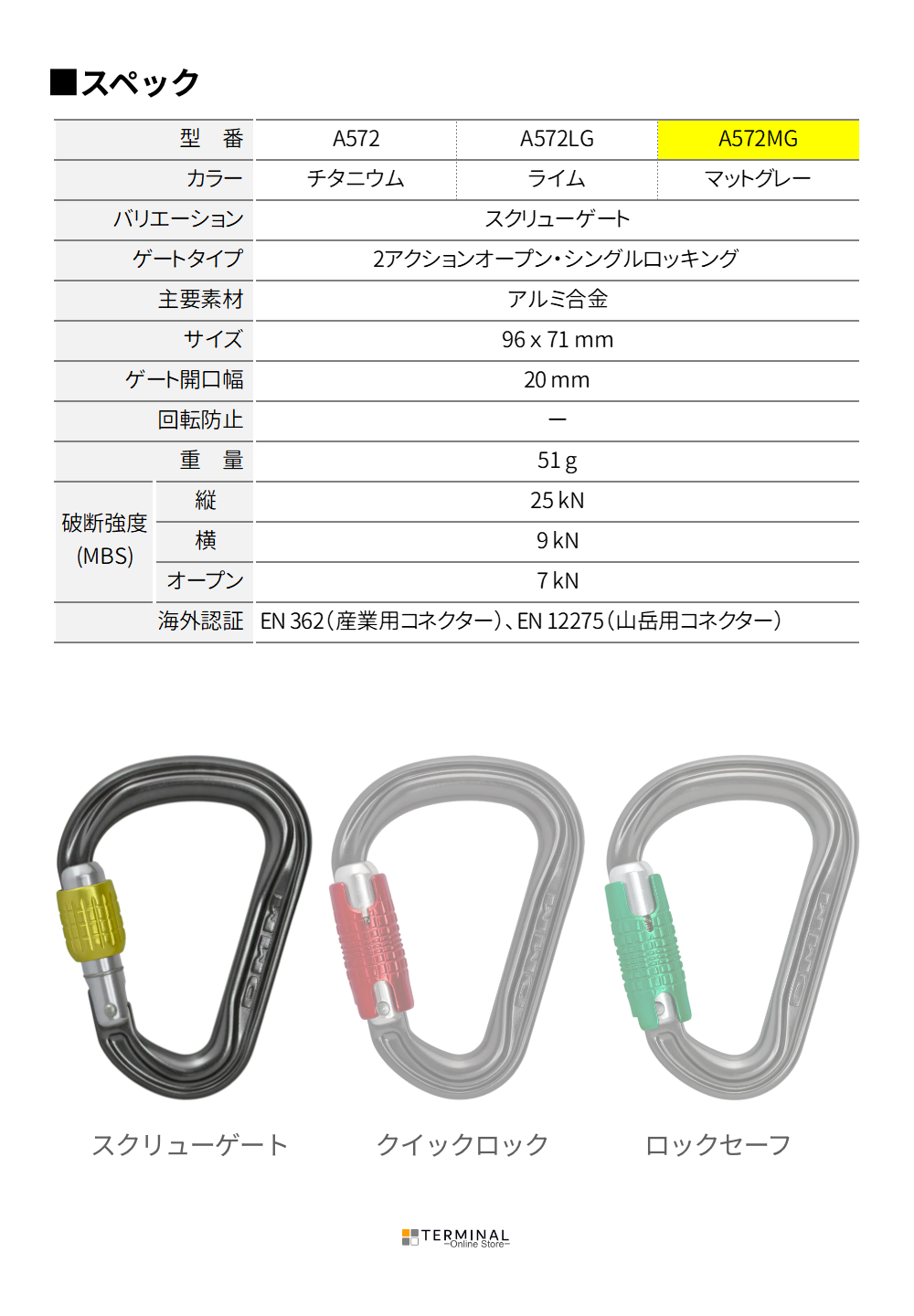 スクリューゲート | 51 g | 20 mm | 25 kN | 9 kN | 7 kN |