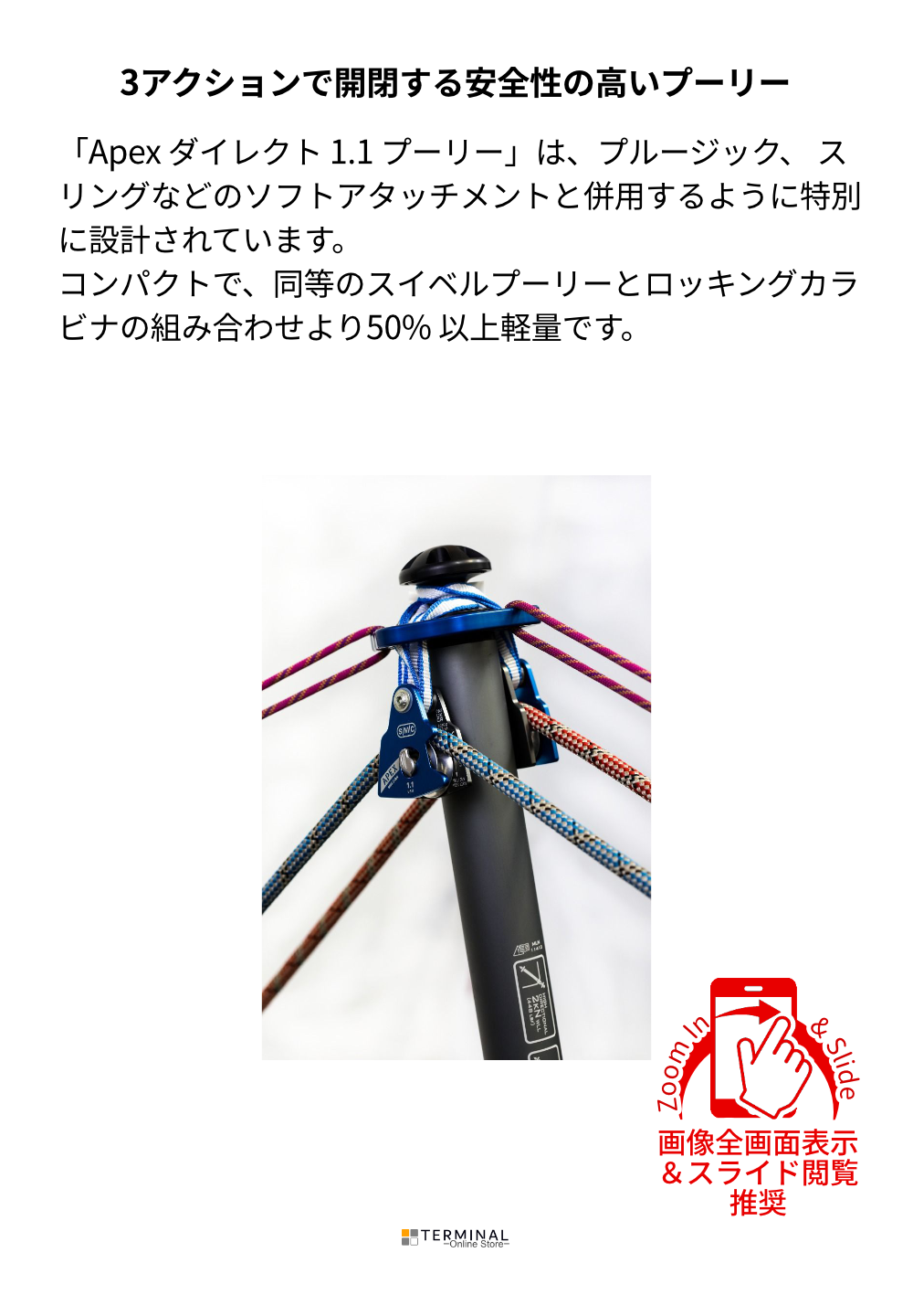 Apex ダイレクト 1.1 プーリー は、従来のプーリーに対するSMC の新しいアプローチです。 プルージック、 スリングなどのソフトアタッチメントと併用するように特別に設計されています。 コンパクトで、同等のスイベルプーリーとロッキングカラビナの組み合わせより50% 以上軽量です。 Apex ダイレクト はミッドラインに取り付け可能で、薄型の特許取得済みのトリプルアクションロック機構を利用した片手操作が特徴です。 このロックは、『ロックボタンを回転』させ、『押し下げ』、『サイドプレートを回転』させる、という3つの異なるアクションによって開きます。 これにより、 プーリーが意図的に開かれるまで確実にロックされた状態が維持され、操作中の安全性が向上します。