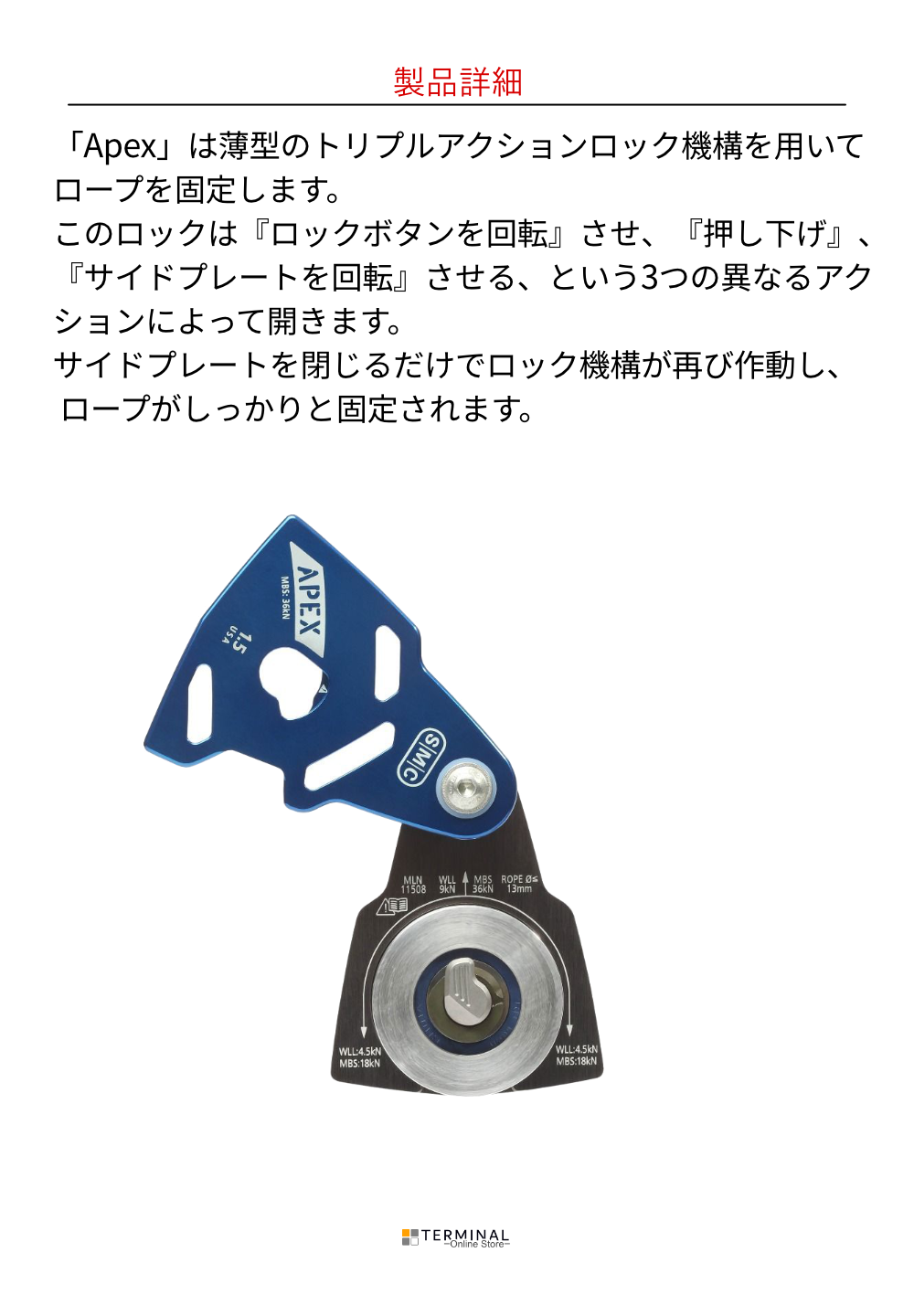 Apex ダイレクトは、従来のプーリーに対するSMCの新しいアプローチです。 プルージック、 スリングなどのソフトアタッチメントと併用するように特別に設計されています。 コンパクトで、 同等のスイベルプーリーとロッキングカラビナの組み合わせよりも50% 以上軽量です。 Apex ダイレクトはミッドラインに取り付け可能で、 薄型の特許取得済みのトリプルアクションロック機構を利用した片手操作が特徴です。 このロックは、『ロックボタンを回転』させ、『押し下げ』、『サイドプレートを回転』させる、という3つの異なるアクションによって開きます。 これにより、 プーリーが意図的に開かれるまで確実にロックされた状態が維持され、操作中の安全性が向上します。
