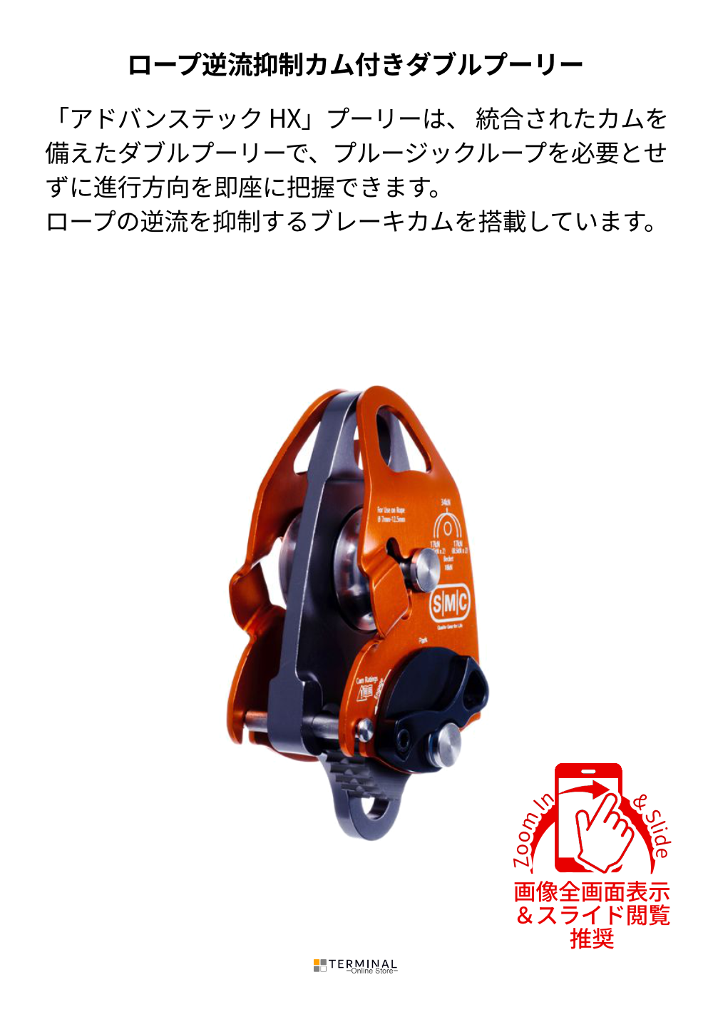 アドバンステックHX プーリーは、 統合されたカムを備えたダブルプーリーで、プルージックループを必要とせずに進行方向を即座に把握できます。ロープの逆流を抑制するブレーキカムを搭載。 高品質のアルミニウムで製造されており、腐食を防ぐために陽極酸化処理が施されています。アドバンステックHX プーリーは、7mmから最大12.5mmまでのロープ直径に対応します。小型のメカニカルシステムが使用されるあらゆるレスキュー用途に最適です。
