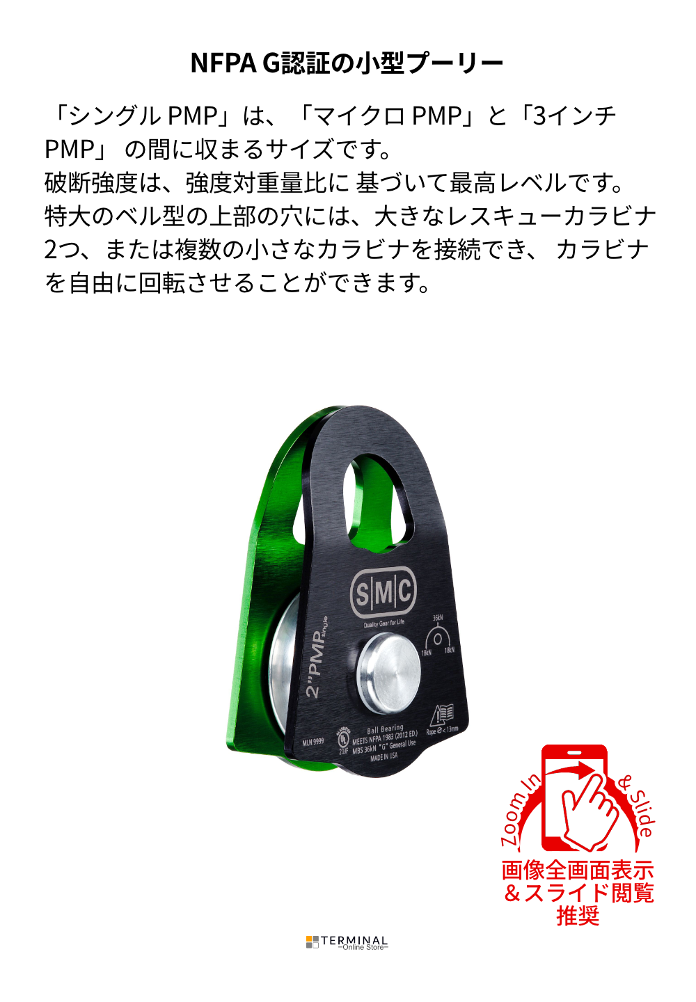 シングル PMP は、マイクロ PMPと3インチ PMP の間に収まるサイズです。このプーリーは、 NFPA 「G」 一般用途を満たす UL認定プーリーの中で最も軽量なものの1つです。破断強度は、強度対重量比に 基づいて最高レベルです。