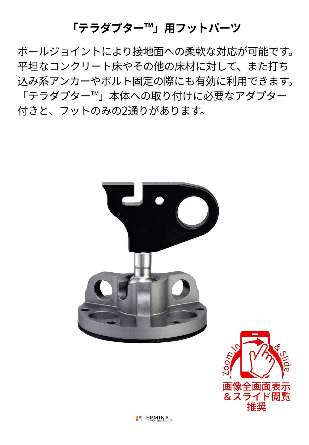 ボールジョイントにより接地面への柔軟な対応が可能 です。平坦なコンクリート床やその他の床材に対して、 また打ち込み系アンカーやボルト固定の際にも有効に 利用できます。テラダプター™本体への取り付けに必 要なアダプター付きと、フットのみの2通りがあります。