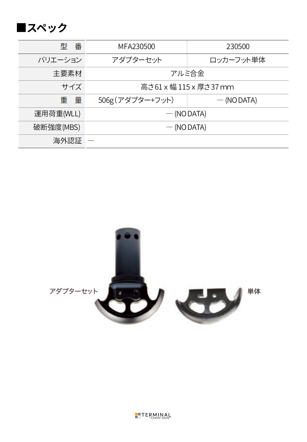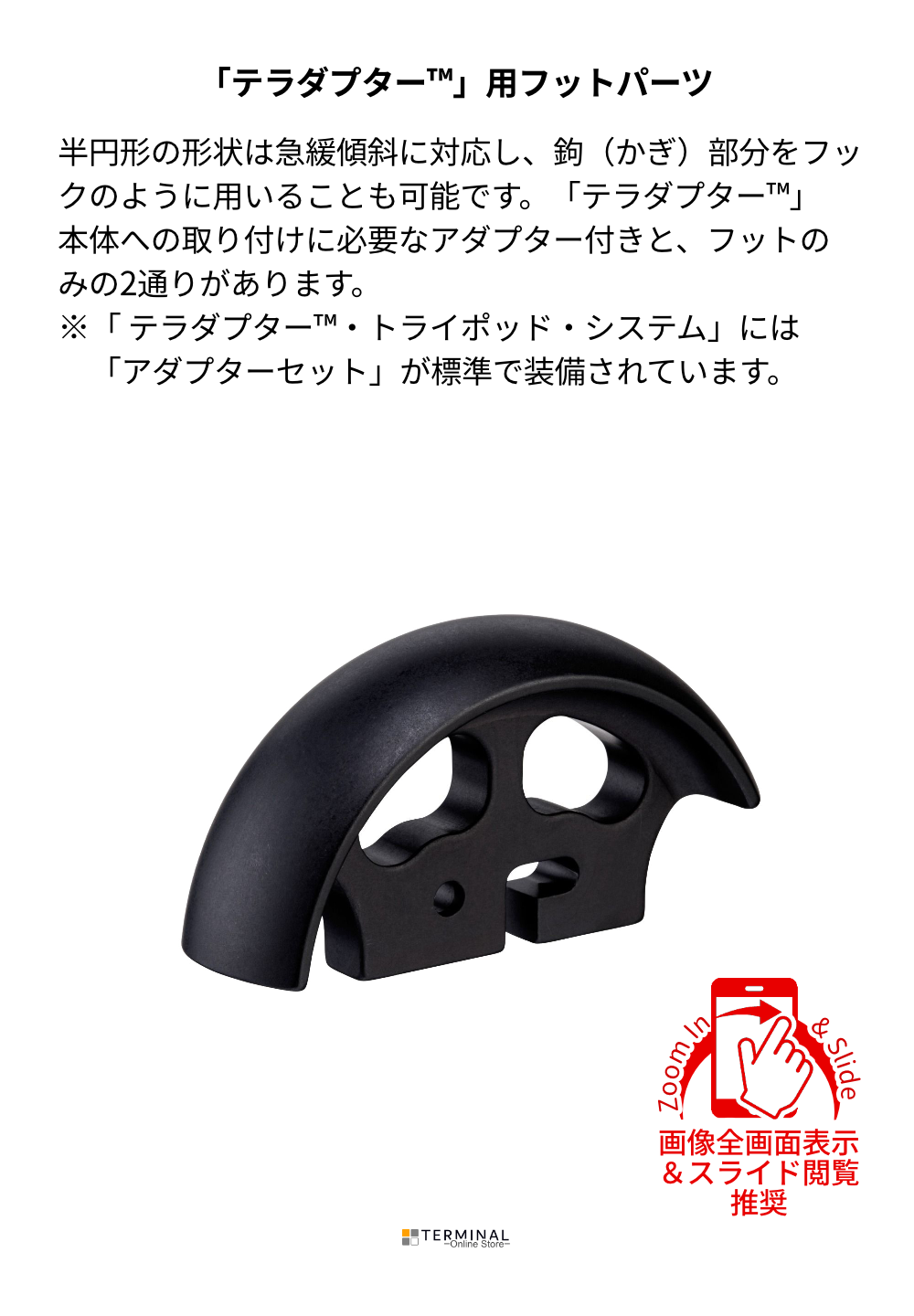 半円形の形状は急緩傾斜に対応し、鉤(かぎ)部分をフッ クのように用いることも可能です。テラダプター™本体 への取り付けに必要なアダプター付きと、フットのみの 2通りがあります。