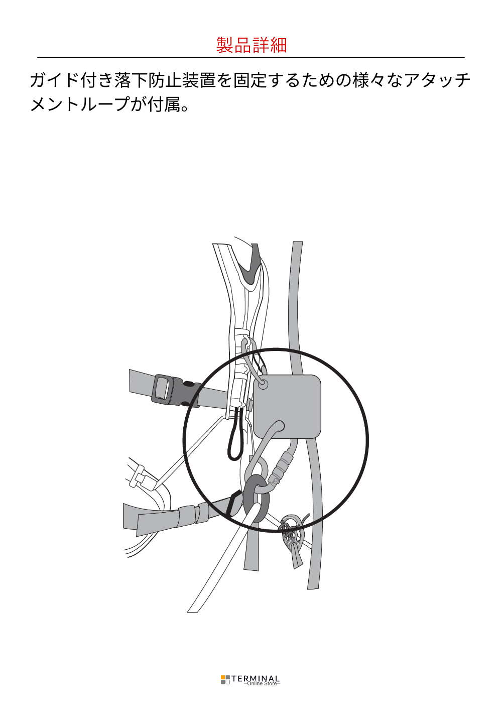 - ガイド付き落下防止装置を固定するための様々なアタッチメントループが付属。