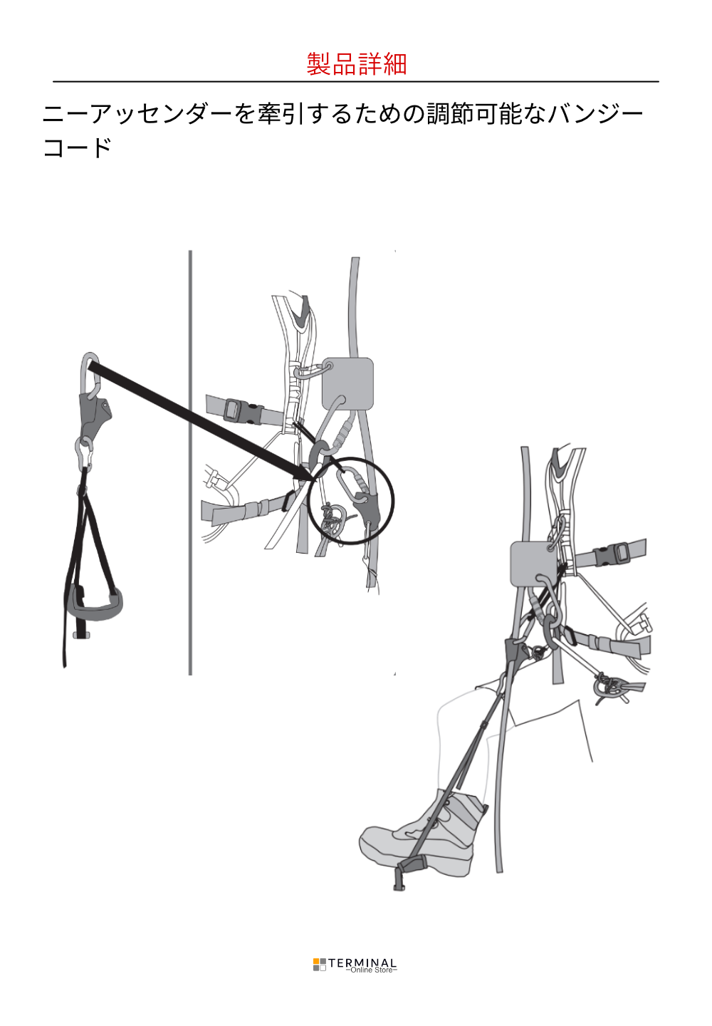 - ニーアッセンダーを運搬するための調整可能なバンジーコード。