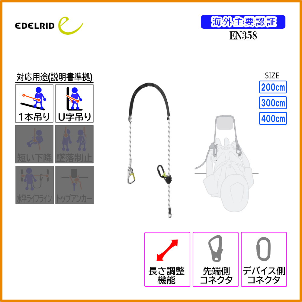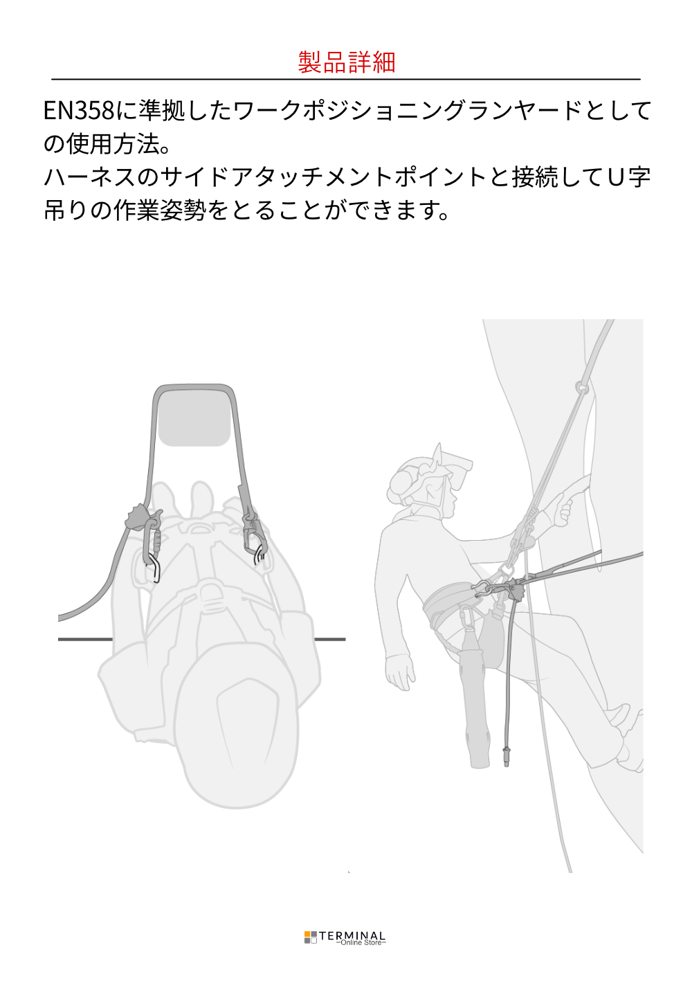 12mmのカーンマントルロープを使用した、高所でのワークポジショニング用の調整可 能なランヤード(EN 358に準拠)です。ロープクランプを使用し、長さをすばやく簡 単に調整できます。