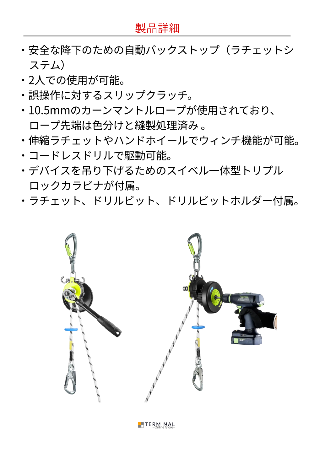 電動 (コードレスドリル)または手動(ラチェット、ハンドホイール)で操作できます。特許 取得済みのバックストップを備えたウィンチ機能により、人を持ち上げたり、その後の安 全な下降に必要な安全チェーンの負担を軽減したりすることができます。