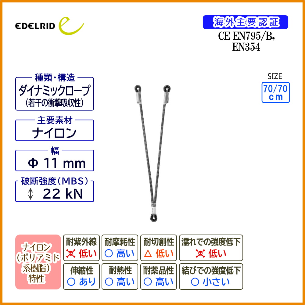 エネルギーを吸収するダイナミックロープ(ダイナマイト)で作られたセルフビレイとワ ークポジショニング用のY型のランヤードです。2つのアームにより、状況に応じてさ まざまな使用が可能になります。