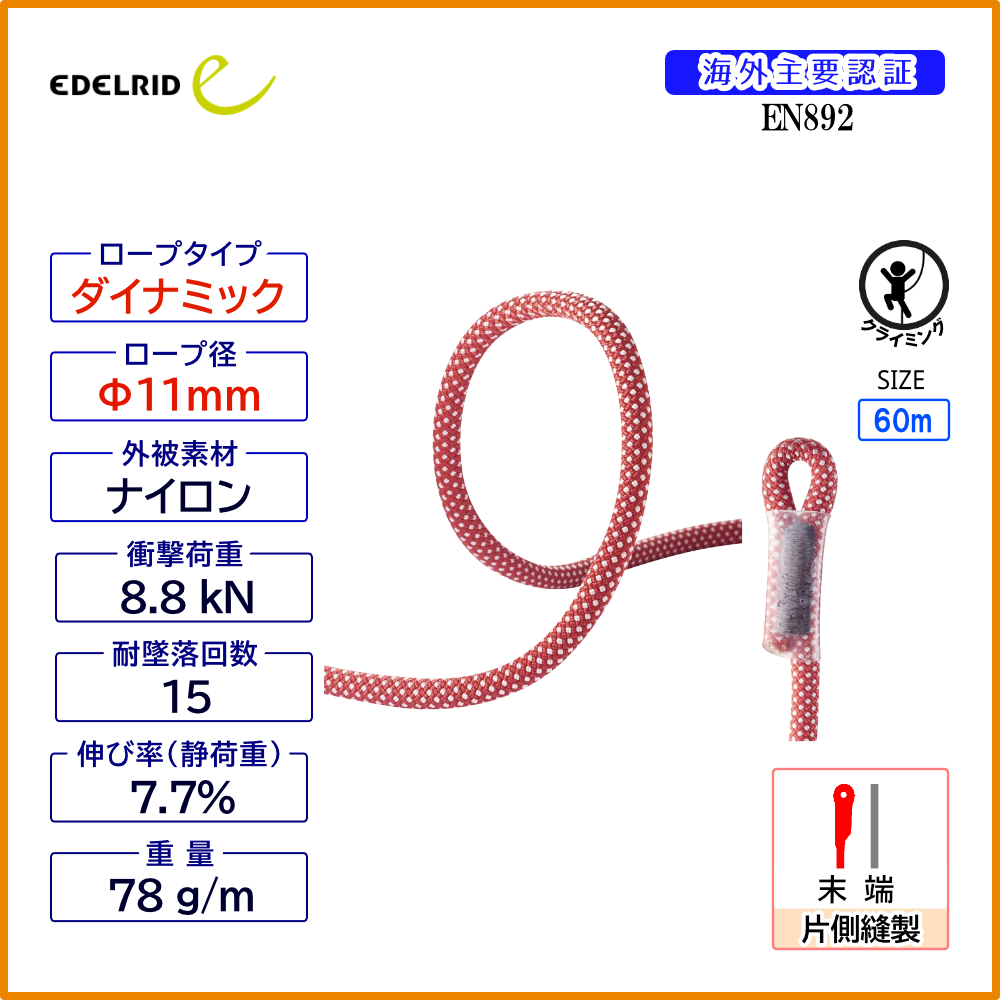【受注発注商品】 EDELRID エーデルリッド ダイナマイト 11 mm 1アイ 国内正規品 [83824.50m_red]