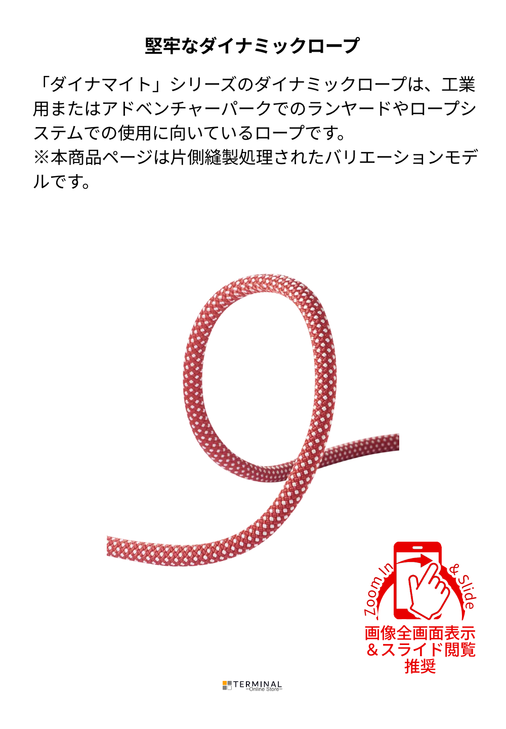 ダイナマイトシリーズのダイナミックロープは、工業用またはアドベンチャーパークでのランヤードや ロープシステムでの使用に向いているロープです。