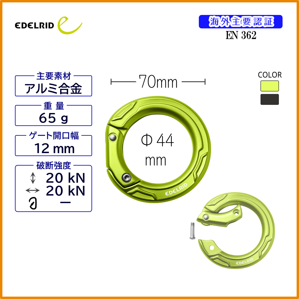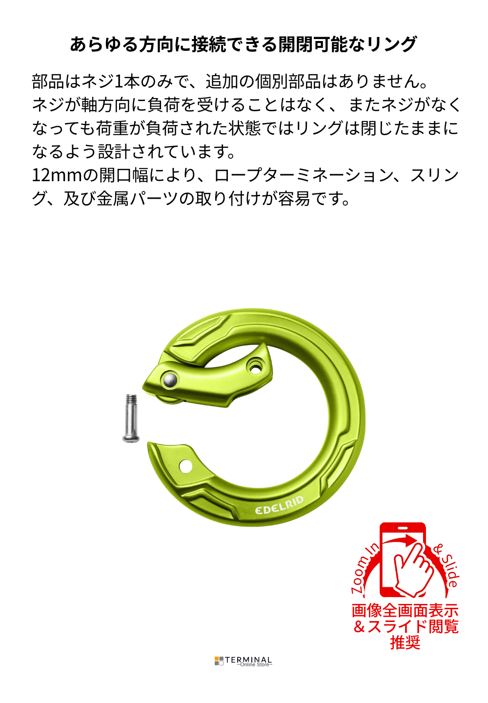デバイスをあらゆる方向に 接続できるEN362Mに準 拠した開閉可能なリングで す。部品はネジ1本のみで、 追加の個別部品はありませ ん。ネジが軸方向に負荷を 受けることはなく、 またネ ジがなくなっても荷重が負 荷された状態ではリングは 閉じたままになるよう 設計 されています。12mmの開 口幅により、ロープターミ ネーション、スリング、お よび金属パーツの取り付け が容易です。