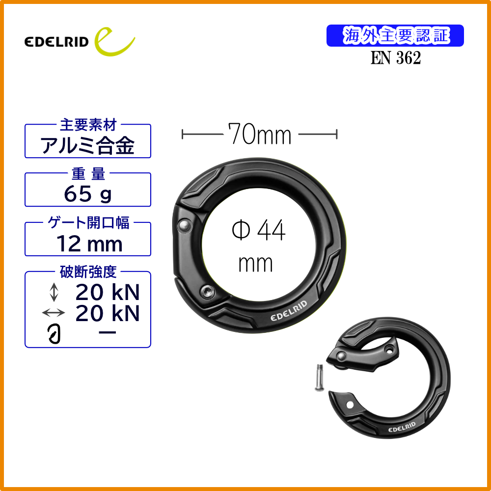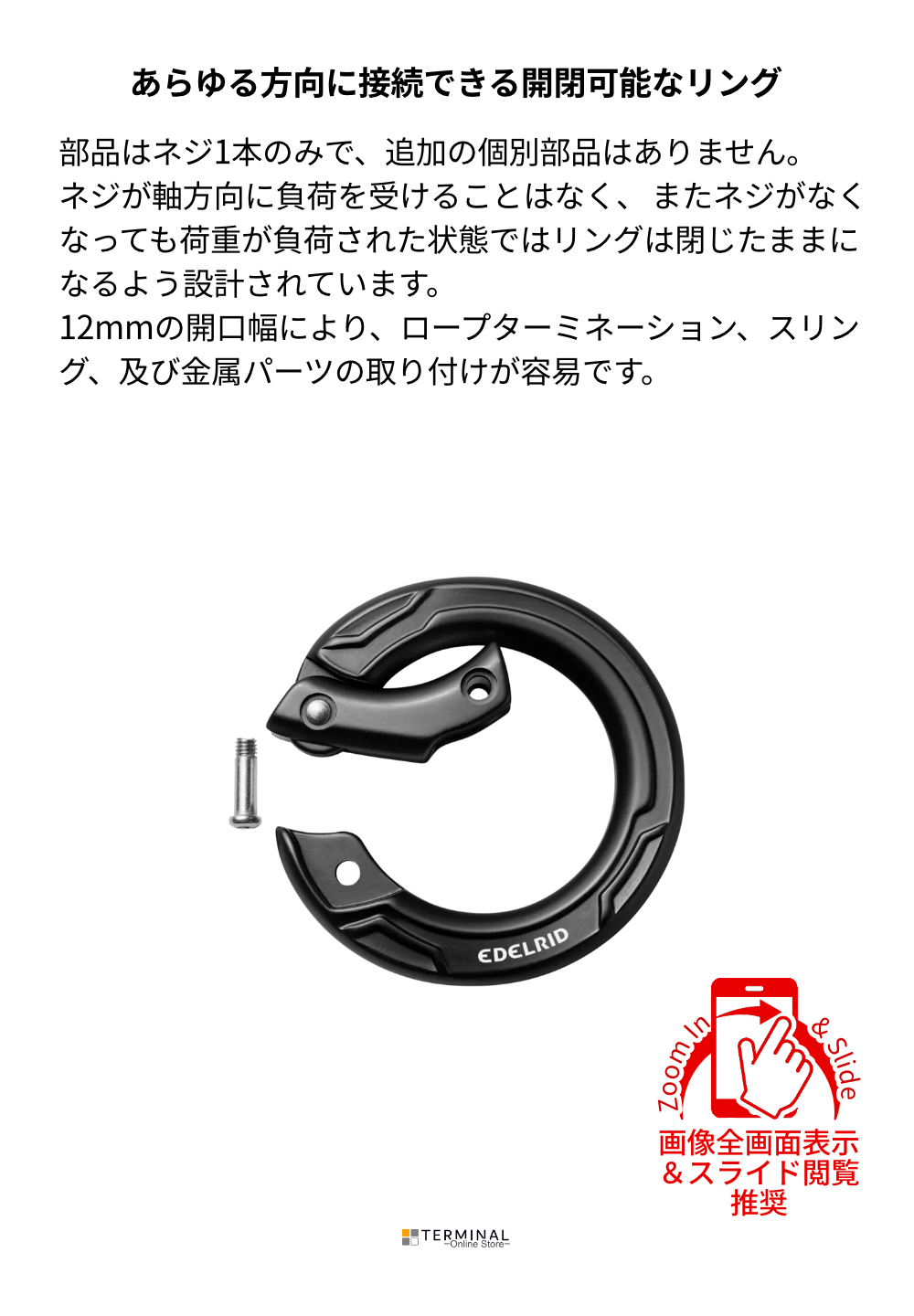 デバイスをあらゆる方向に 接続できるEN362Mに準 拠した開閉可能なリングで す。部品はネジ1本のみで、 追加の個別部品はありませ ん。ネジが軸方向に負荷を 受けることはなく、 またネ ジがなくなっても荷重が負 荷された状態ではリングは 閉じたままになるよう 設計 されています。12mmの開 口幅により、ロープターミ ネーション、スリング、お よび金属パーツの取り付け が容易です。