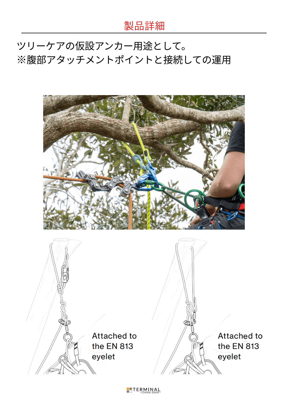 認証:EN358、EN795B、ANSI Z133、AS 1891.5(12.9mmのみ)、AS/NZS 5532(2名荷重)、CEN/TS 16415(2名荷重)