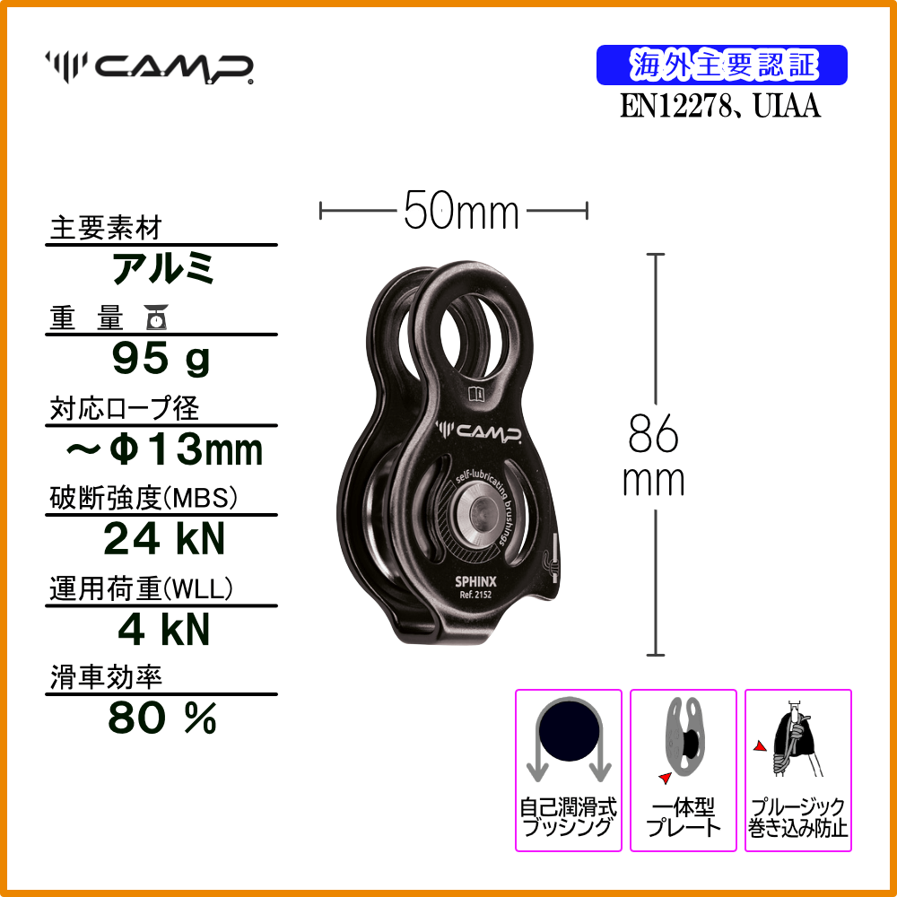 メインの取り付けポイントにより、カラビナを完全に回転させることができます。 Φ13 mmまでのロープに使用可能。プレートの片側はプルージック巻き込み防止形状となっており、荷揚げ時にプルージックコードがプーリー内部に入り込んでしまうことを防ぎます。自己潤滑ブッシングは、低速での軽い用途には十分効率を発揮します(効率: 80%)。アルミニウム合金のボディとホイール、ステンレス鋼のアクスル。