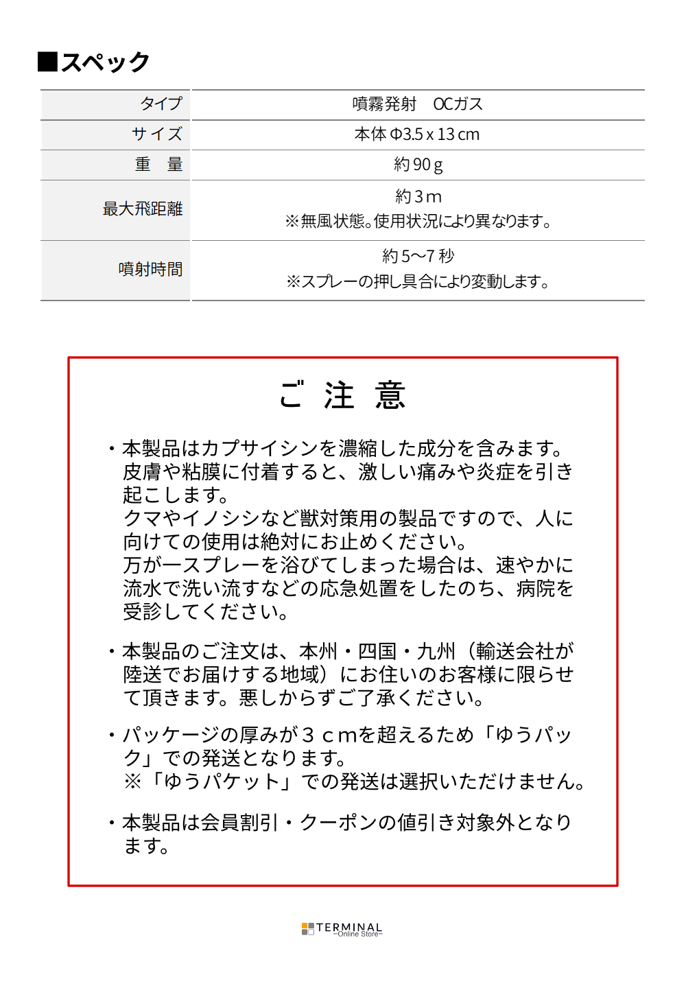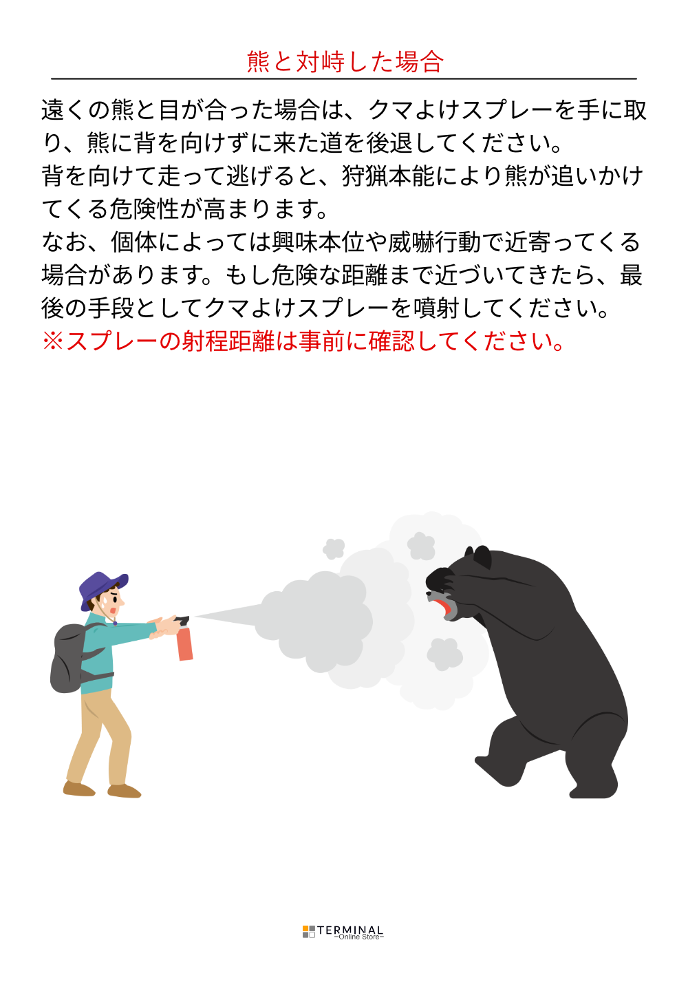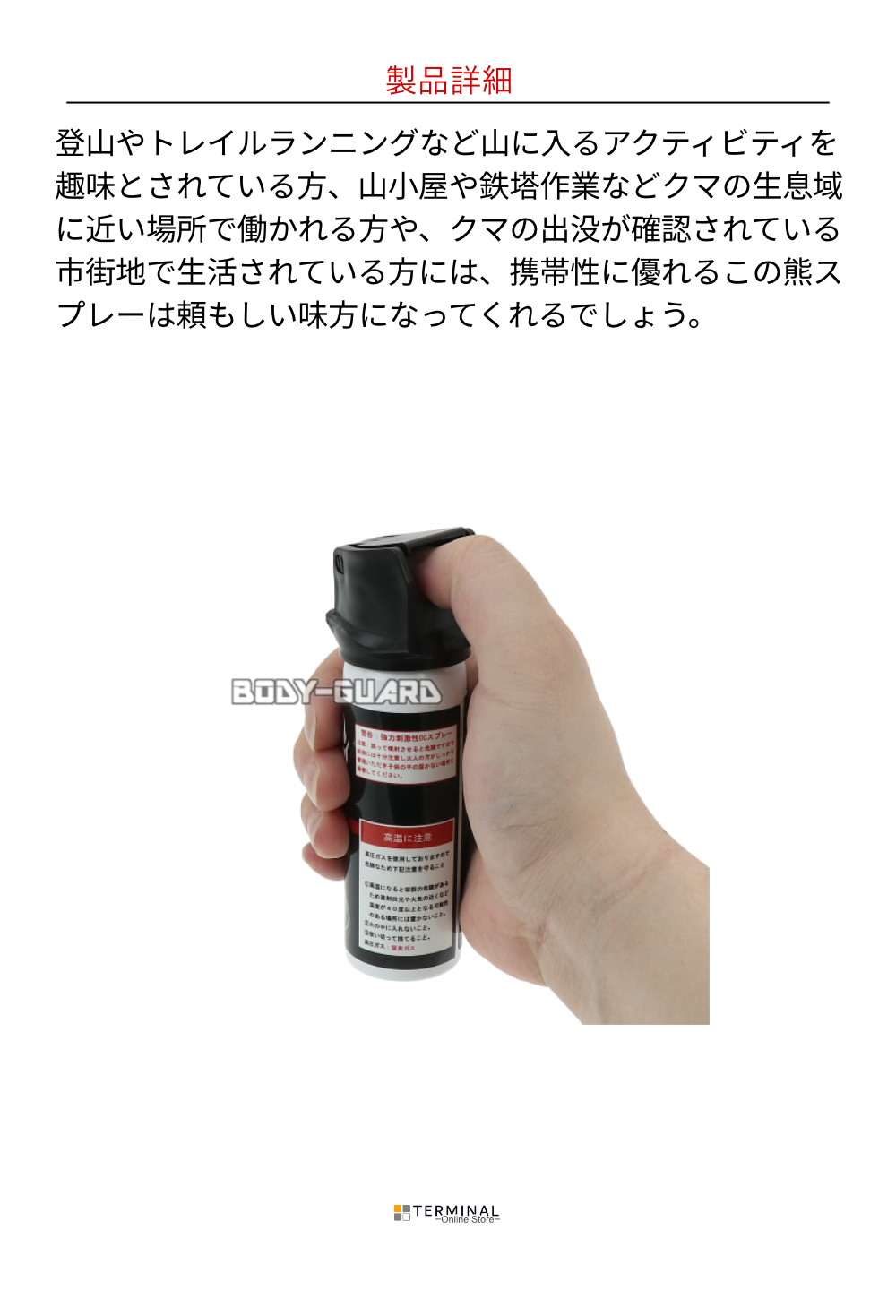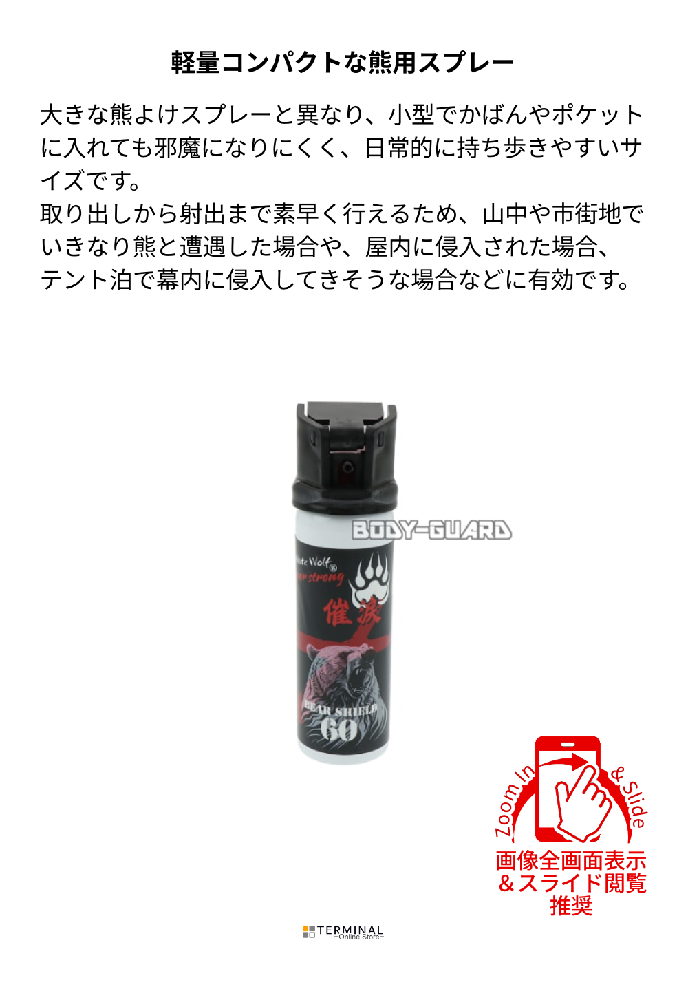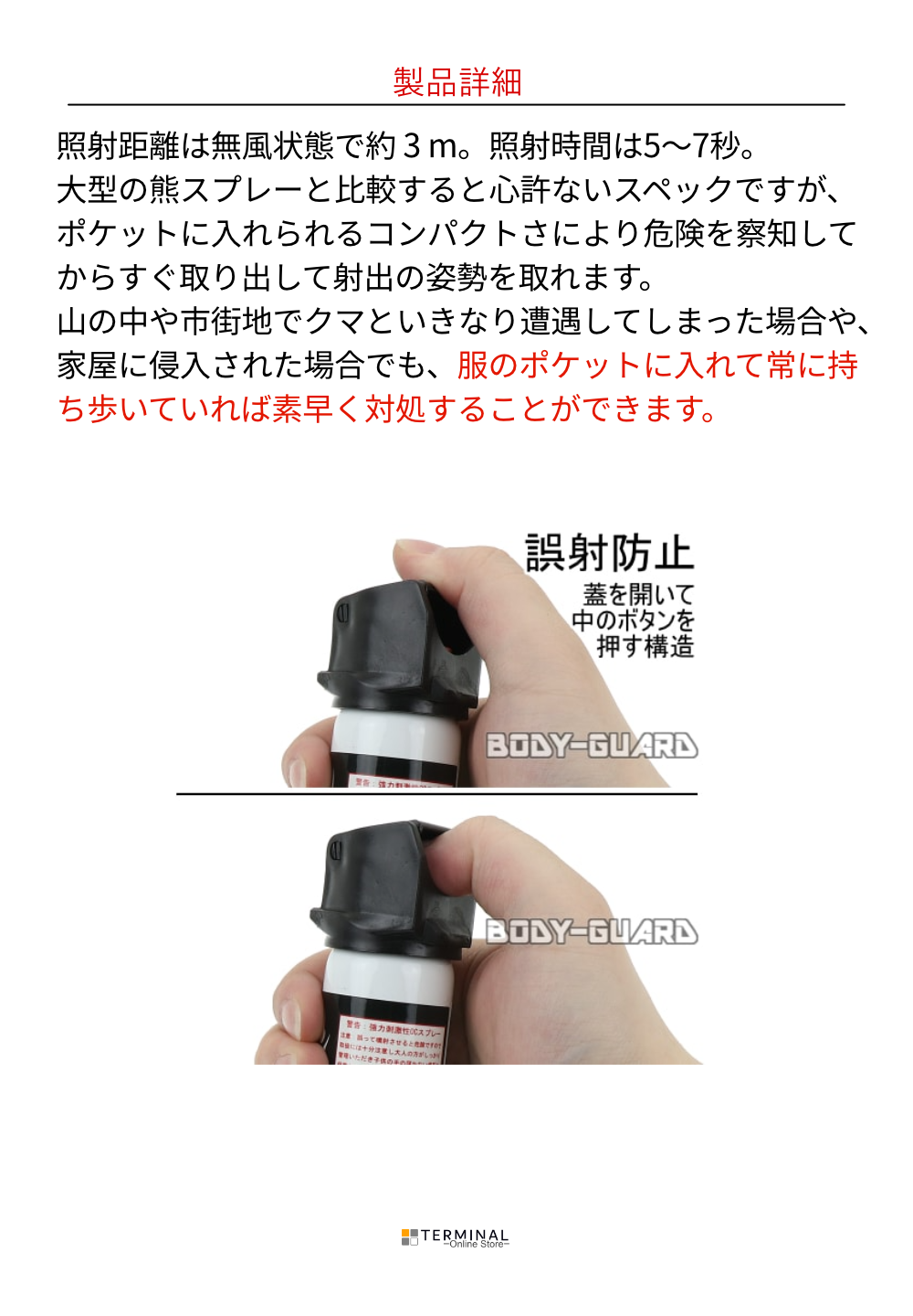 最近では、山以外の街中でも熊の出没がニュースで報道されることが増えています。本商品は、従来の大きな熊よけスプレーと異なり、小型でかばんやポケットに入れても邪魔になりにくく、日常的に持ち歩きやすいです。 近所で熊が出たというニュースを聞いて不安を感じることがあったら、手軽に安心感を持ちたい方に最適な熊よけスプレーです!