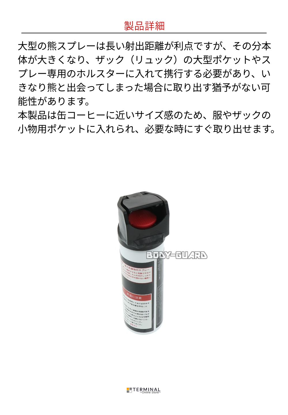 ※本品の射程は 3 m と短めになっています。半面、缶コーヒー程度のサイズと極めてコンパクトなため、服のポケットなどに入れて常に携行することができ、いきなり熊と遭遇してしまった場合でもすぐ取り出せます。