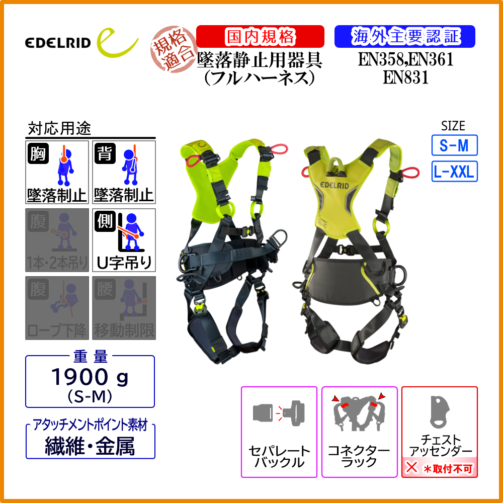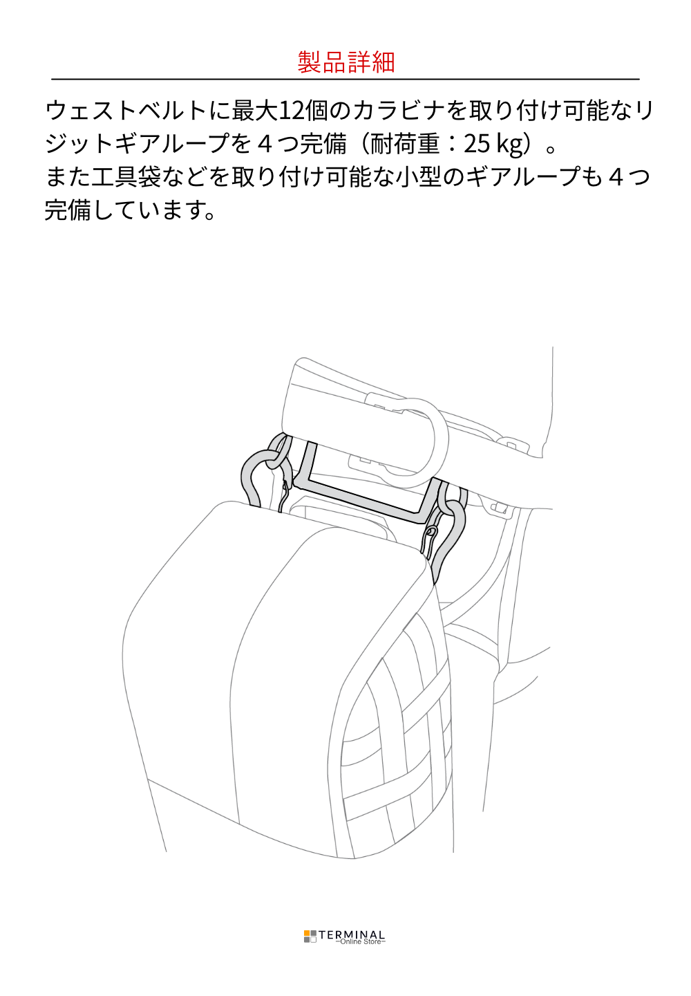 ● EN 361に準拠したテキスタイルの落下防止アイレット(背面に1つ、胸部に2つ)は、荷重負荷時