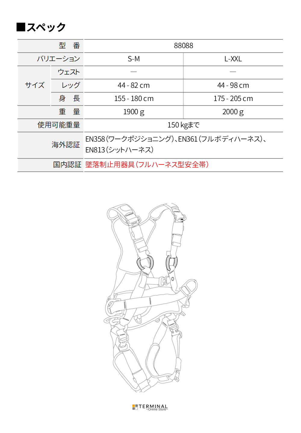 メーカー本国にて日本の墜落制止用器具の規格に準拠したテストを行い、テストをクリアした製品は【国内仕入先を通して墜落制止用器具適合品として販売】しております。シットハーネス(サドル)の場合は特定のチェストハーネスと組み合わせて適合したり、ランヤード(ショックアブソーバー付きランヤード)の場合は特定のコネクター(カラビナ)と組み合わせて適合するモデルもございます。また墜落制止用器具非適合のモデルもございます。適合状況は各商品ページに記載しております。 なお、国内正規品として流通しているもののみが墜落制止用器具に適合しております。同じ製品であっても、個人輸入や並行輸入店経由など非正規のルートで入ってきたものは規格適合を表すタグが付いておらず、非適合品となりますのでご注意ください。 |