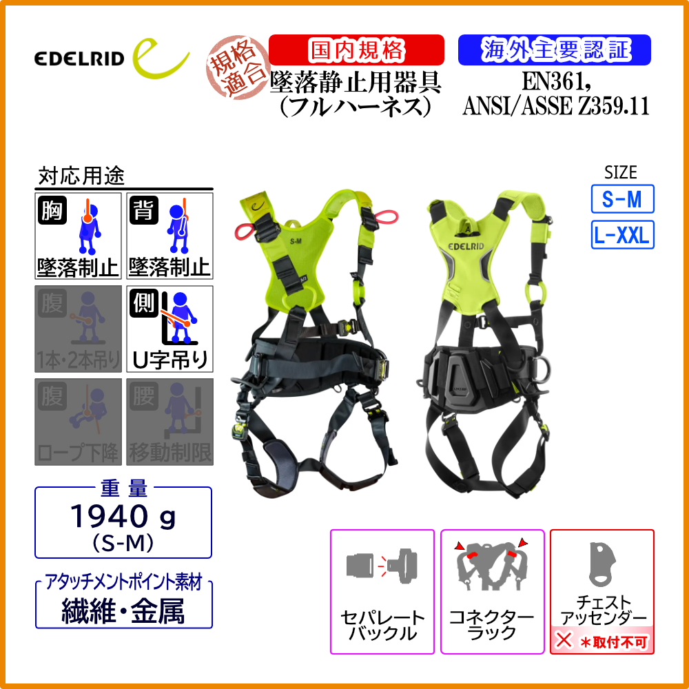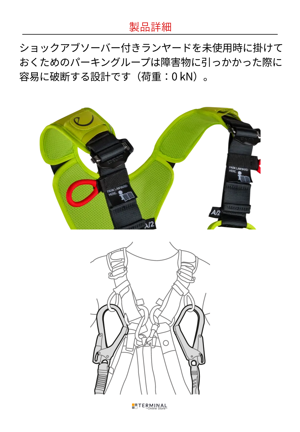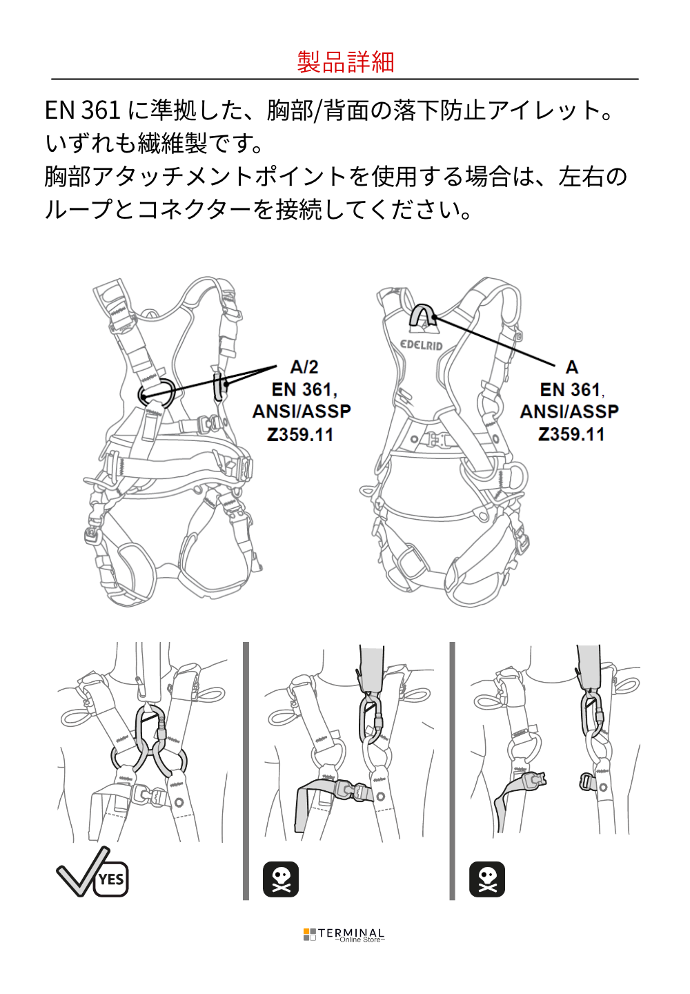 ● EN 361に準拠したテキスタイル落下防止アイレット背面に1箇所、胸部に2箇所は、荷重負荷時