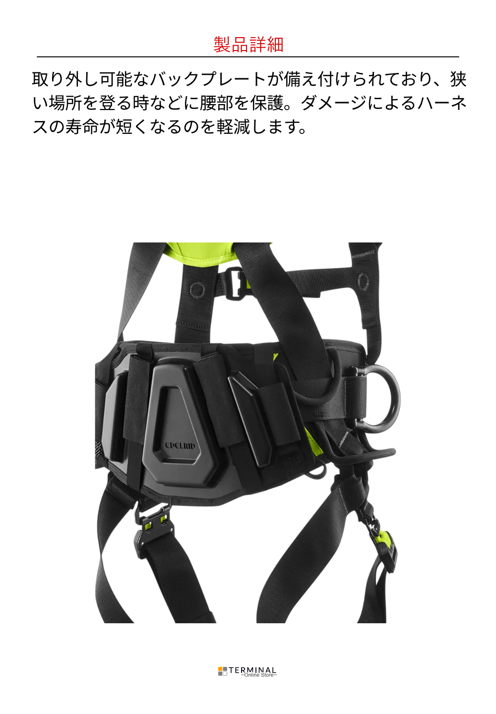 ●取り外し可能なバックプレートが備え付けられており、狭い場所を登る時などに腰部の保護力を