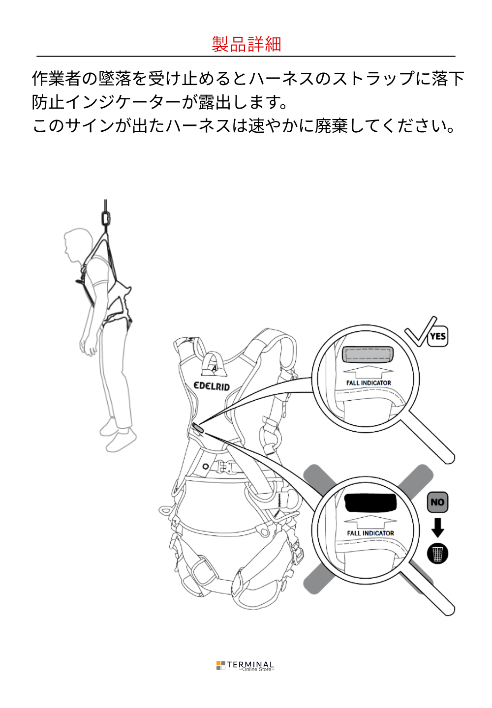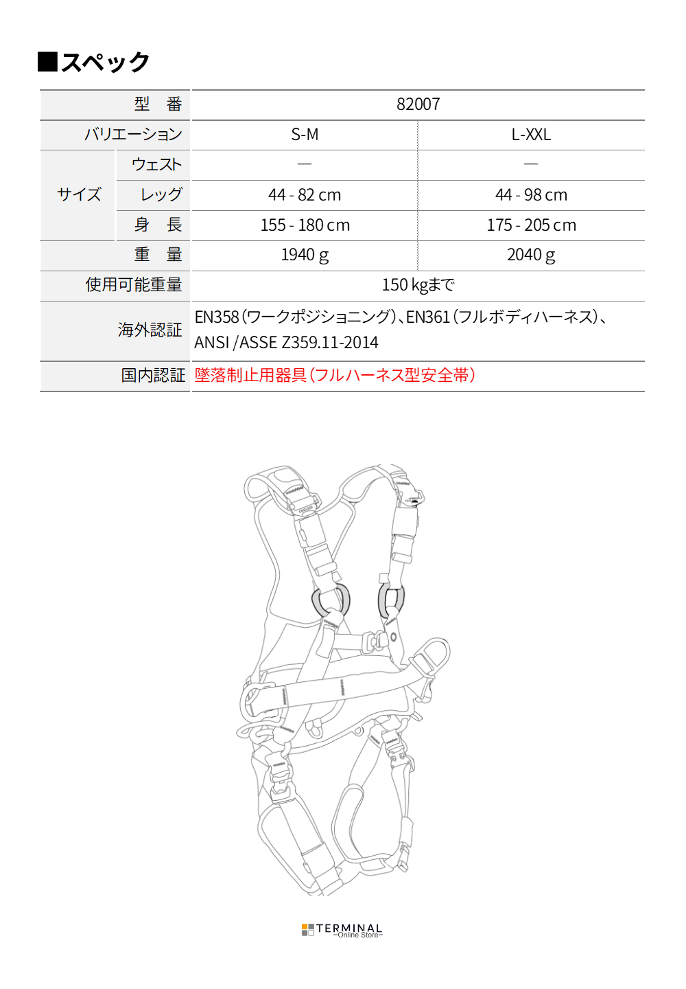 メーカー本国にて日本の墜落制止用器具の規格に準拠したテストを行い、テストをクリアした製品は【国内仕入先を通して墜落制止用器具適合品として販売】しております。シットハーネス(サドル)の場合は特定のチェストハーネスと組み合わせて適合したり、ランヤード(ショックアブソーバー付きランヤード)の場合は特定のコネクター(カラビナ)と組み合わせて適合するモデルもございます。また墜落制止用器具非適合のモデルもございます。適合状況は各商品ページに記載しております。 なお、国内正規品として流通しているもののみが墜落制止用器具に適合しております。同じ製品であっても、個人輸入や並行輸入店経由など非正規のルートで入ってきたものは規格適合を表すタグが付いておらず、非適合品となりますのでご注意ください。 |