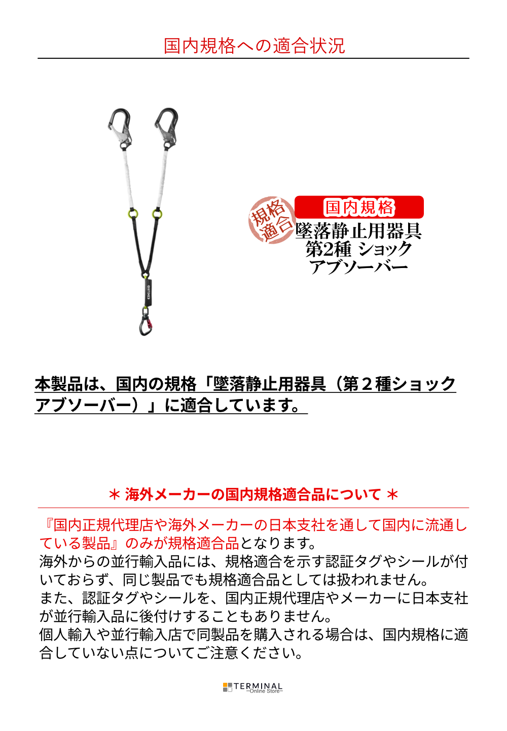 メーカー本国にて日本の墜落制止用器具の規格に準拠したテストを行い、テストをクリアした製品は【国内仕入先を通して墜落制止用器具適合品として販売】しております。シットハーネス(サドル)の場合は特定のチェストハーネスと組み合わせて適合したり、ランヤード(ショックアブソーバー付きランヤード)の場合は特定のコネクター(カラビナ)と組み合わせて適合するモデルもございます。また墜落制止用器具非適合のモデルもございます。適合状況は各商品ページに記載しております。 なお、国内正規品として流通しているもののみが墜落制止用器具に適合しております。同じ製品であっても、個人輸入や並行輸入店経由など非正規のルートで入ってきたものは規格適合を表すタグが付いておらず、非適合品となりますのでご注意ください。 |