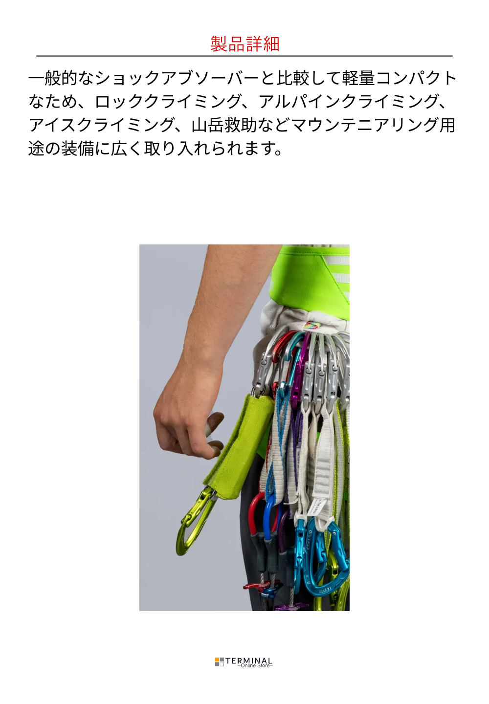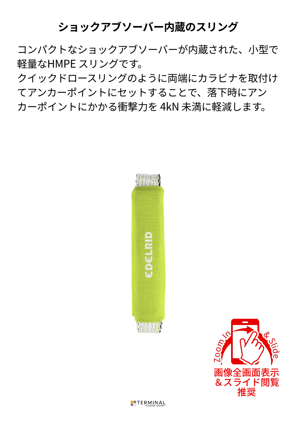 クイックドロースリングのように両端にカラビナを取付けてアンカーポイントにセットすることで、落下時にアンカーポイントにかかる衝撃力を4kN 未満に軽減します。