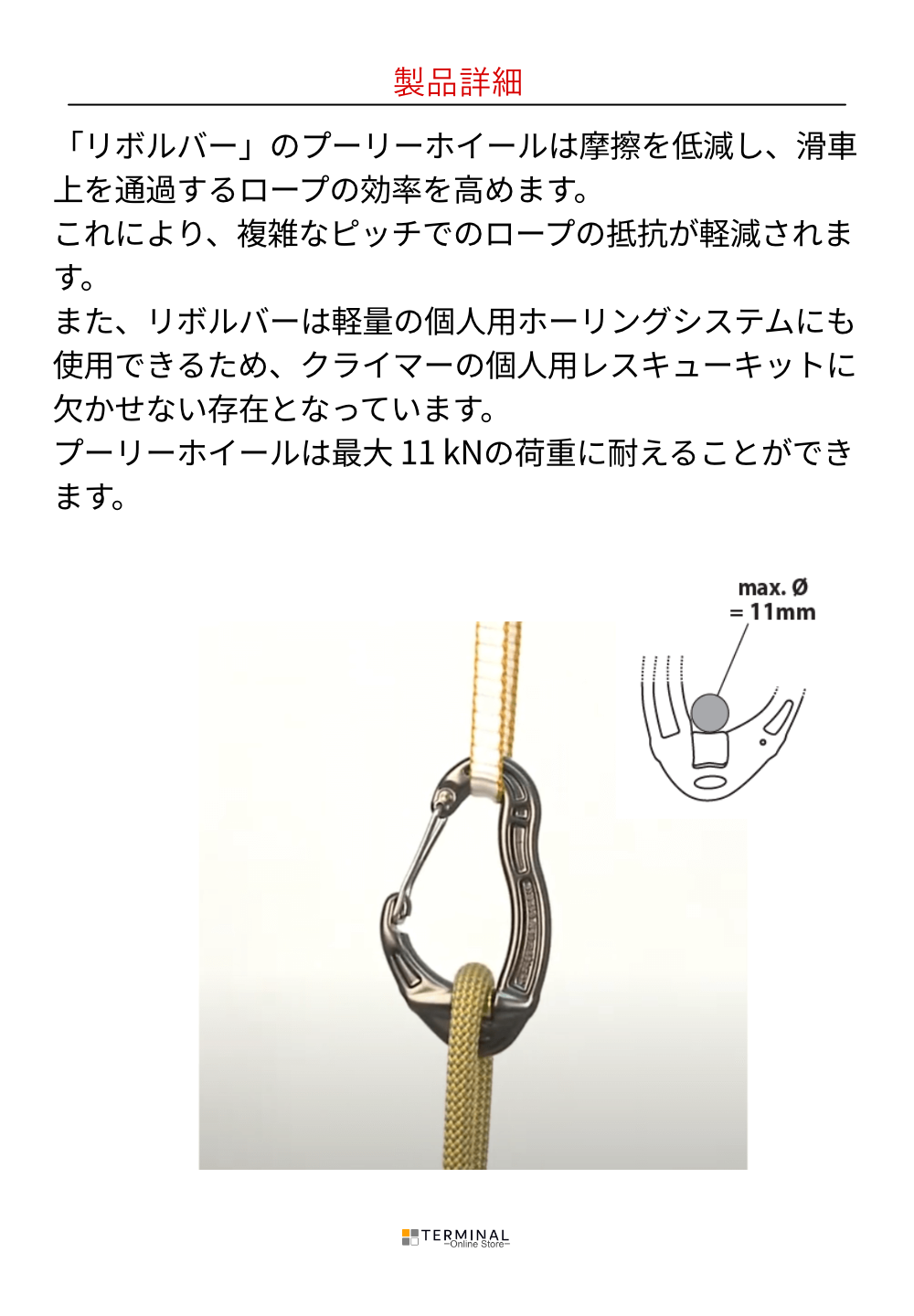 リボルバーの滑車ホイールは摩擦を軽減し、その上を通るロープの効率を高め、複雑なピッチでのロープの抵抗を軽減します。リボルバーは、軽量の個人用運搬システムに機械的な利点を生み出すために使用することもできるため、登山者の個人用レスキュー キットの一部として不可欠なものとなります。プーリーホイールは最大 11kN の荷重で機能します。