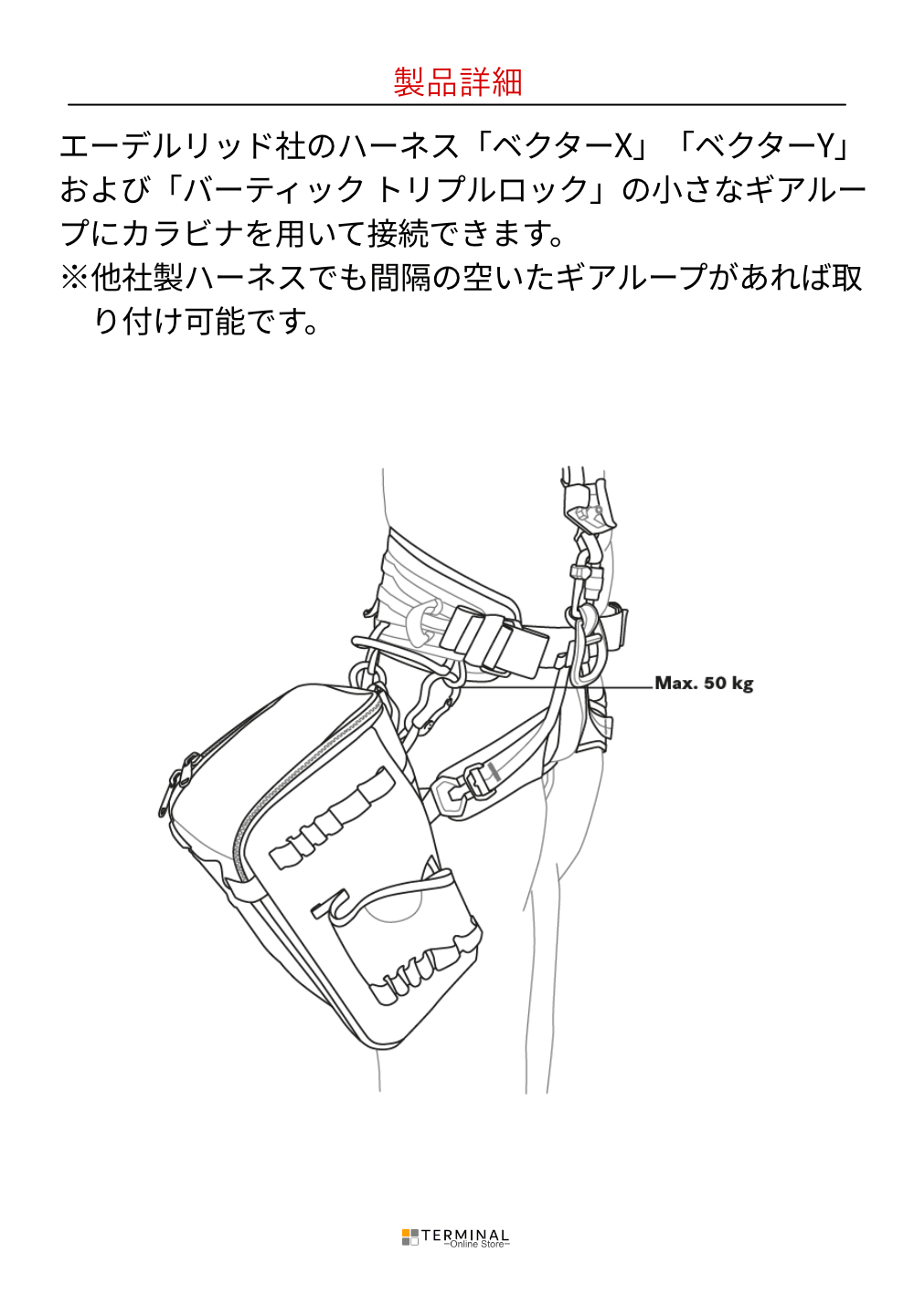 ●ベクターやバーティックハーネスの小さなギアループに取付け可能。