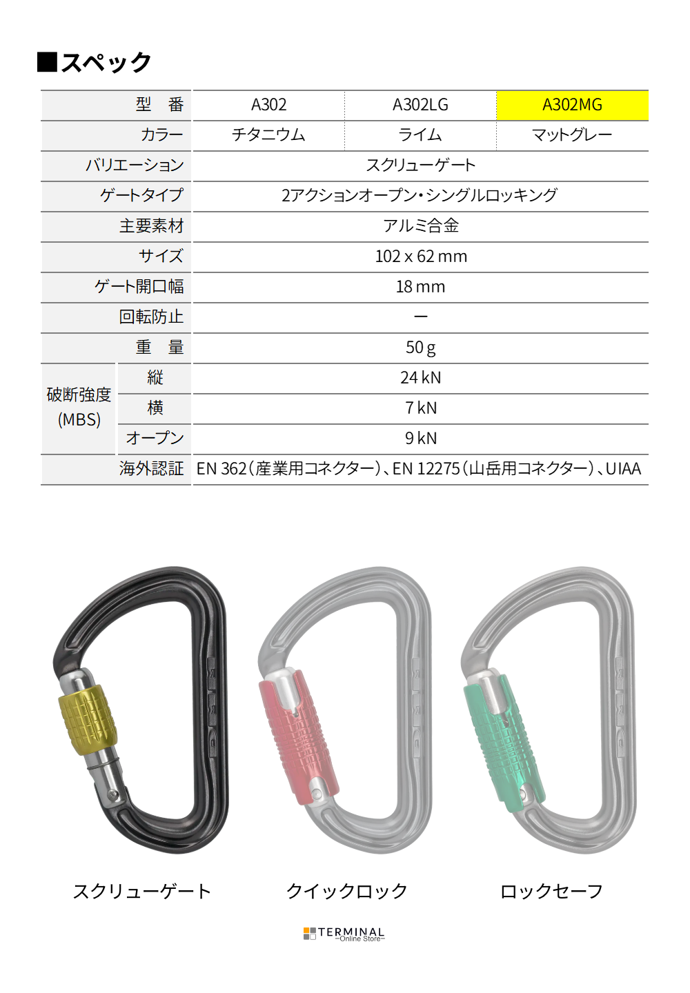 スクリューゲート | 50 g | 18 mm | 24 kN | 7 kN | 9 kN |