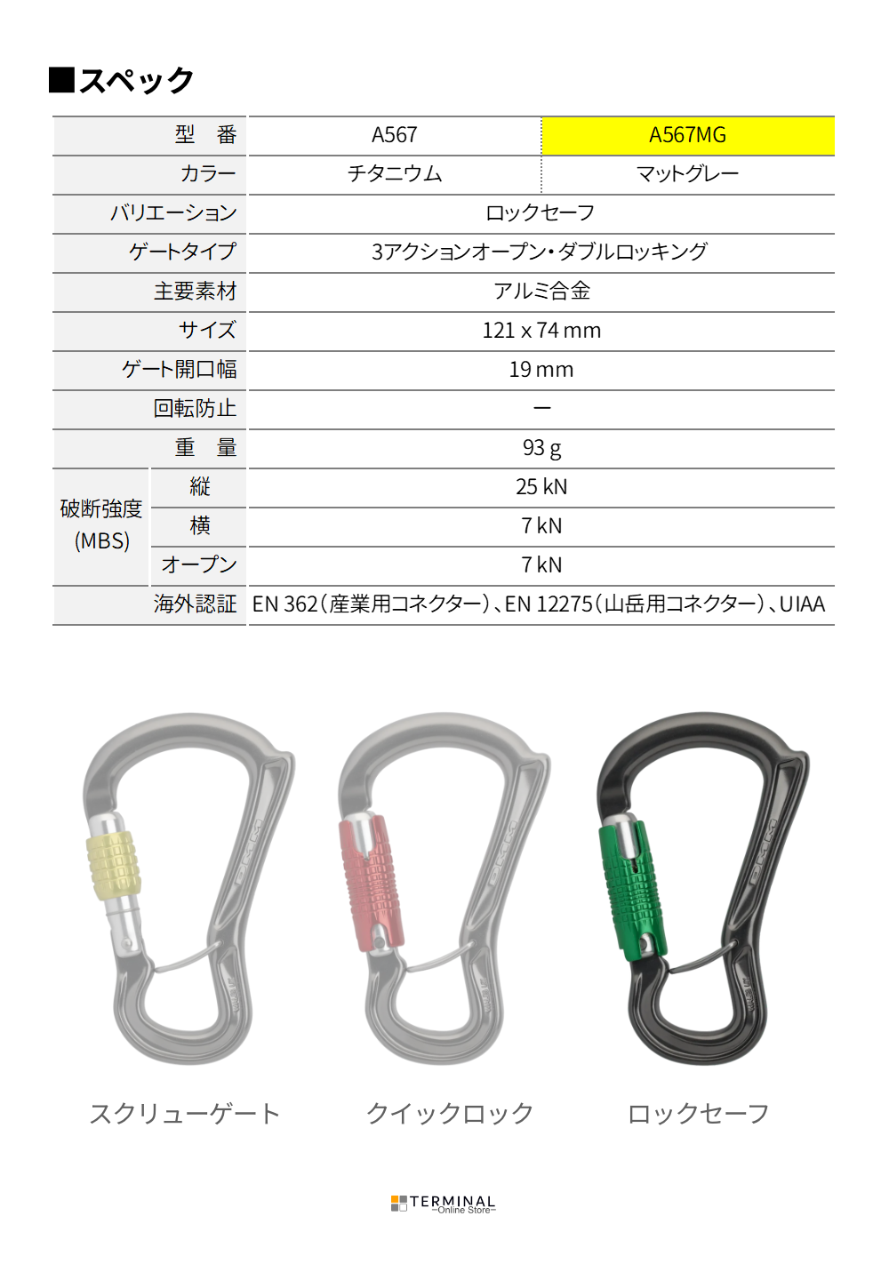 スクリューゲート | 86 g | 20 mm | 25 kN | 7 kN | 7 kN |