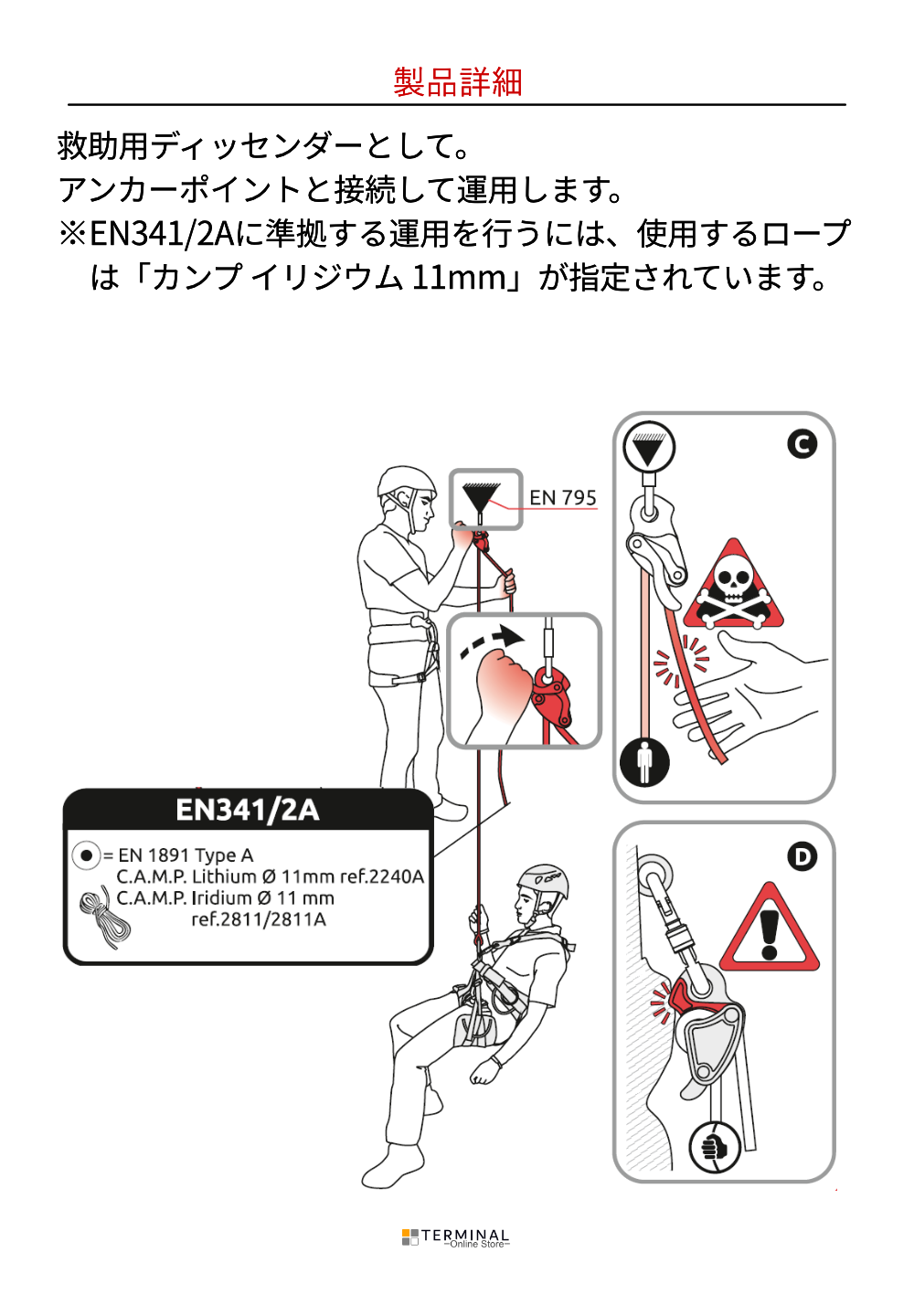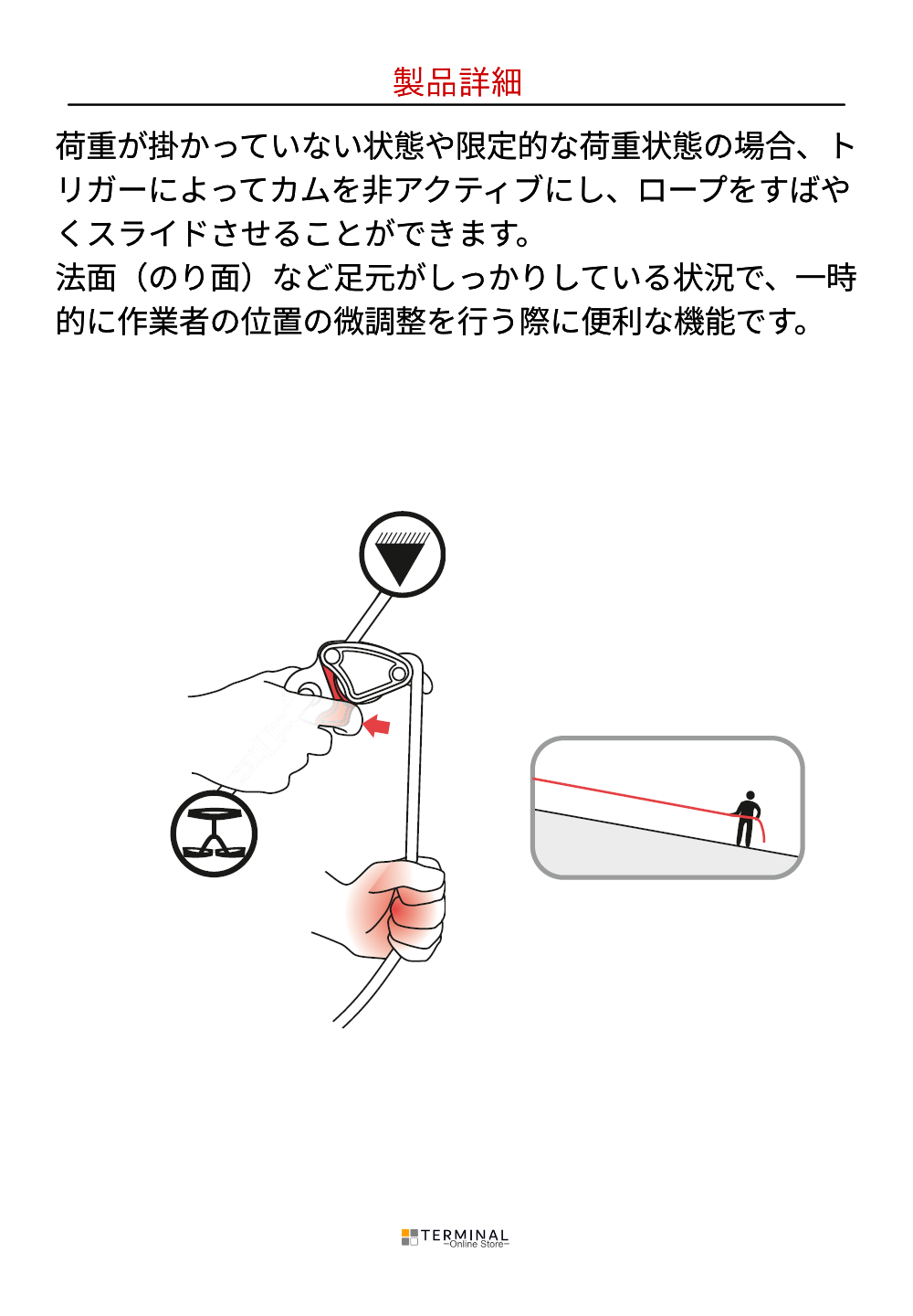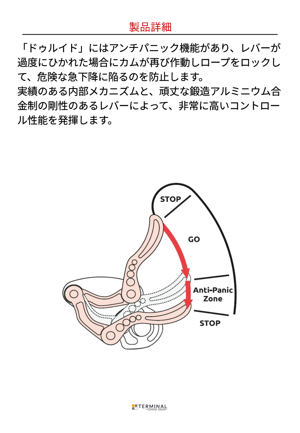 ロープアクセスとレスキューのための軽量でコンパクトな自動制動ディセンダー。セミスタティックロープ10-11mm用に設計されています。レバーの独自のアンチパニック機能は、ハンドルの引きすぎによる危険な下降のスピードをコントロールすることができます。本体とレバーは丈夫な熱鍛造アルミニウム合金製です。機械部品は精密鋳造ステンレス鋼で作られています。内部機構とロッキングカムは特許取得済みの設計を採用。非常に滑らかに作動するロッキングカムは特許取得済でロープのわずかなスリップにより、ショックエネルギーを吸収し、ロープの摩耗や劣化を最小限に抑えます。ロープに対しなめらかに作動するので、ロープ登高が容易です。荷重がかかっていない状態や限定的な荷重状態の場合、トリガーによってカムを非アクティブにし、ロープをすばやくスライドさせることができます。落下防止のキーパーコードを取り付けるスチールリング付。9.9から11mmのダイナミックロープを使用することで登山用に使用可能。ディセンダーとして通常使用は120kgまで、レスキュー時最大200kgまで。