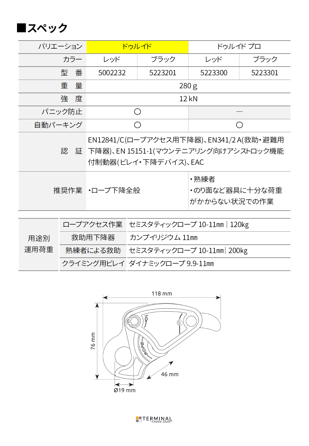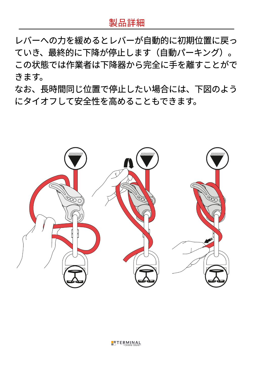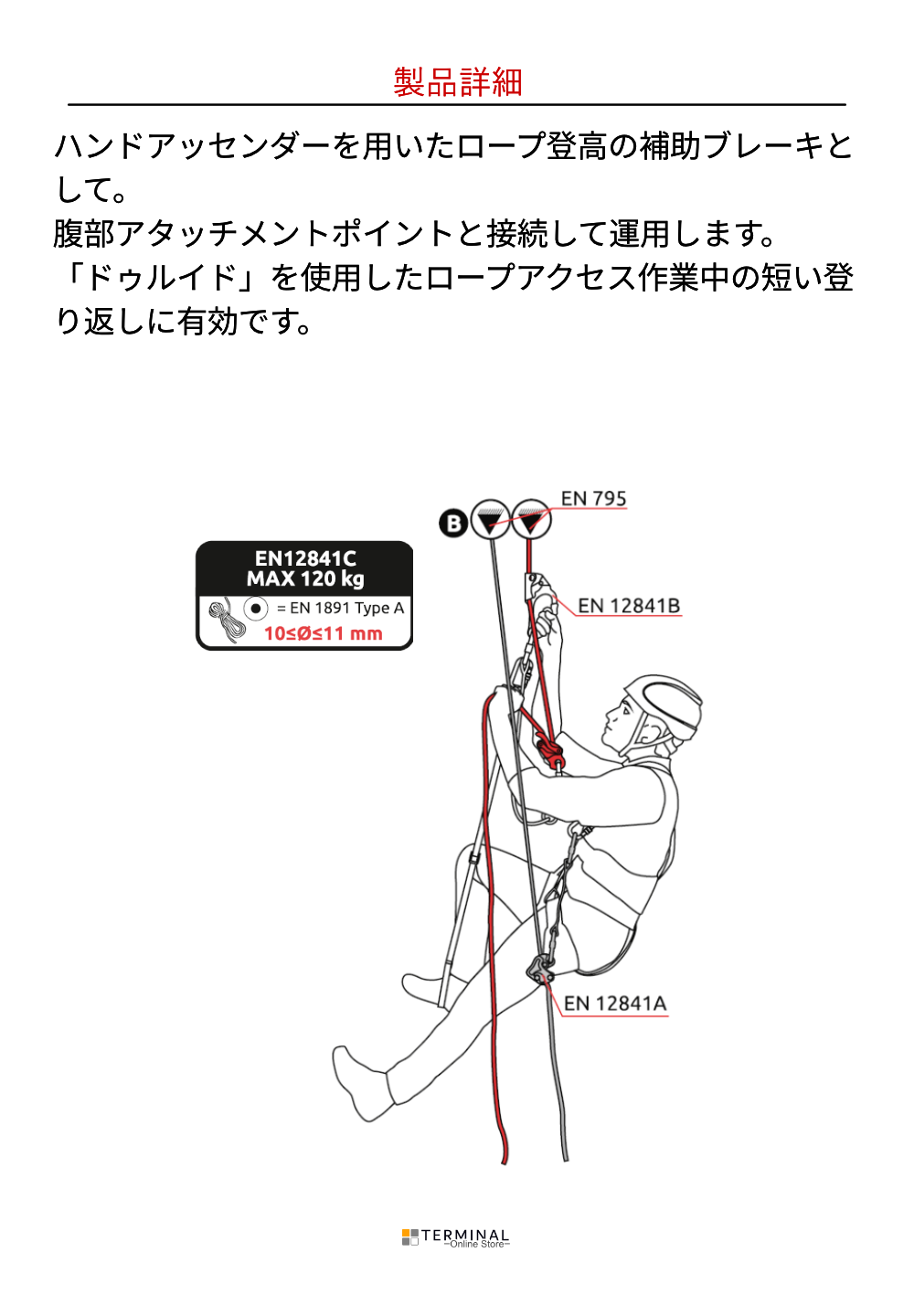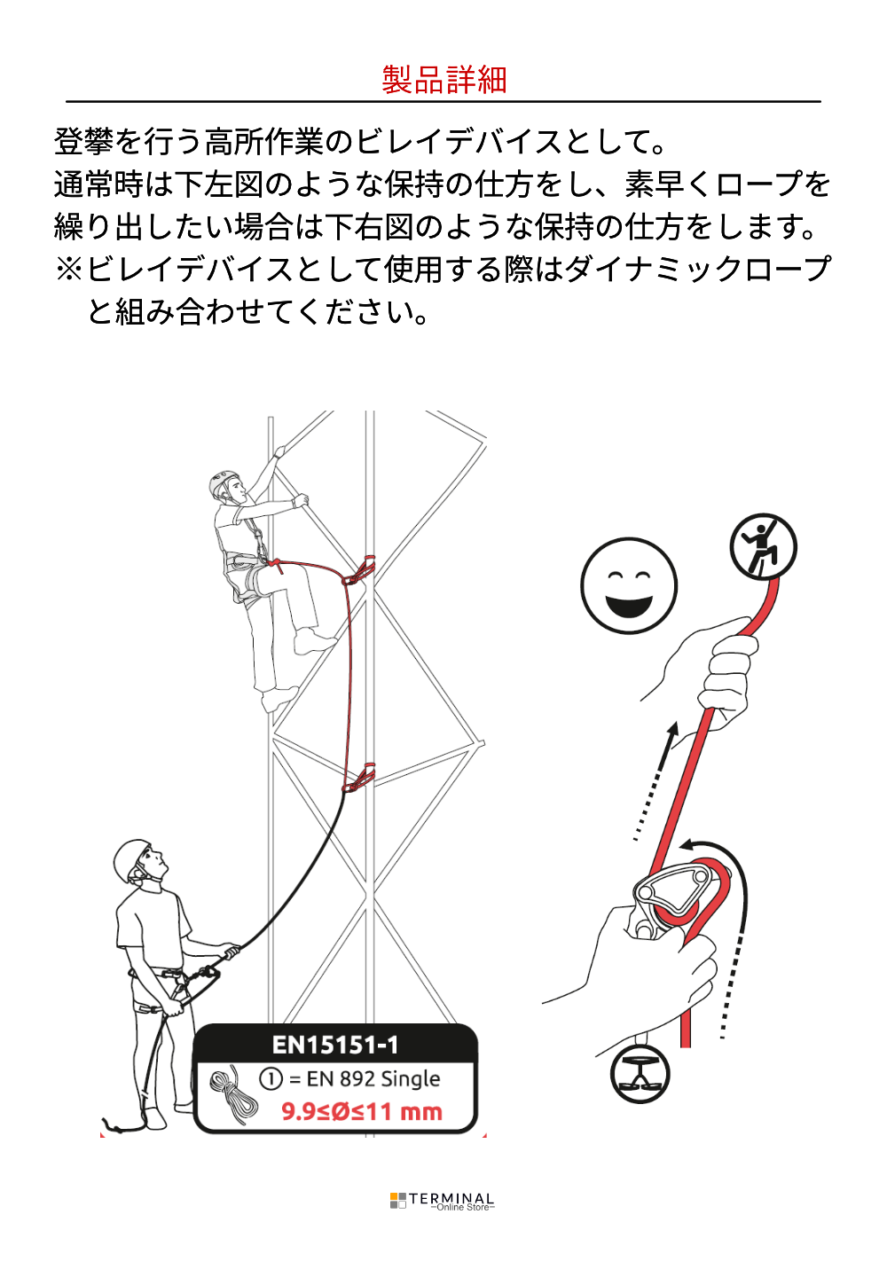 ロープアクセスとレスキューのための軽量でコンパクトな自動制動ディセンダー。セミスタティックロープ10-11mm用に設計されています。レバーの独自のアンチパニック機能は、ハンドルの引きすぎによる危険な下降のスピードをコントロールすることができます。本体とレバーは丈夫な熱鍛造アルミニウム合金製です。機械部品は精密鋳造ステンレス鋼で作られています。内部機構とロッキングカムは特許取得済みの設計を採用。非常に滑らかに作動するロッキングカムは特許取得済でロープのわずかなスリップにより、ショックエネルギーを吸収し、ロープの摩耗や劣化を最小限に抑えます。ロープに対しなめらかに作動するので、ロープ登高が容易です。荷重がかかっていない状態や限定的な荷重状態の場合、トリガーによってカムを非アクティブにし、ロープをすばやくスライドさせることができます。落下防止のキーパーコードを取り付けるスチールリング付。9.9から11mmのダイナミックロープを使用することで登山用に使用可能。ディセンダーとして通常使用は120kgまで、レスキュー時最大200kgまで。