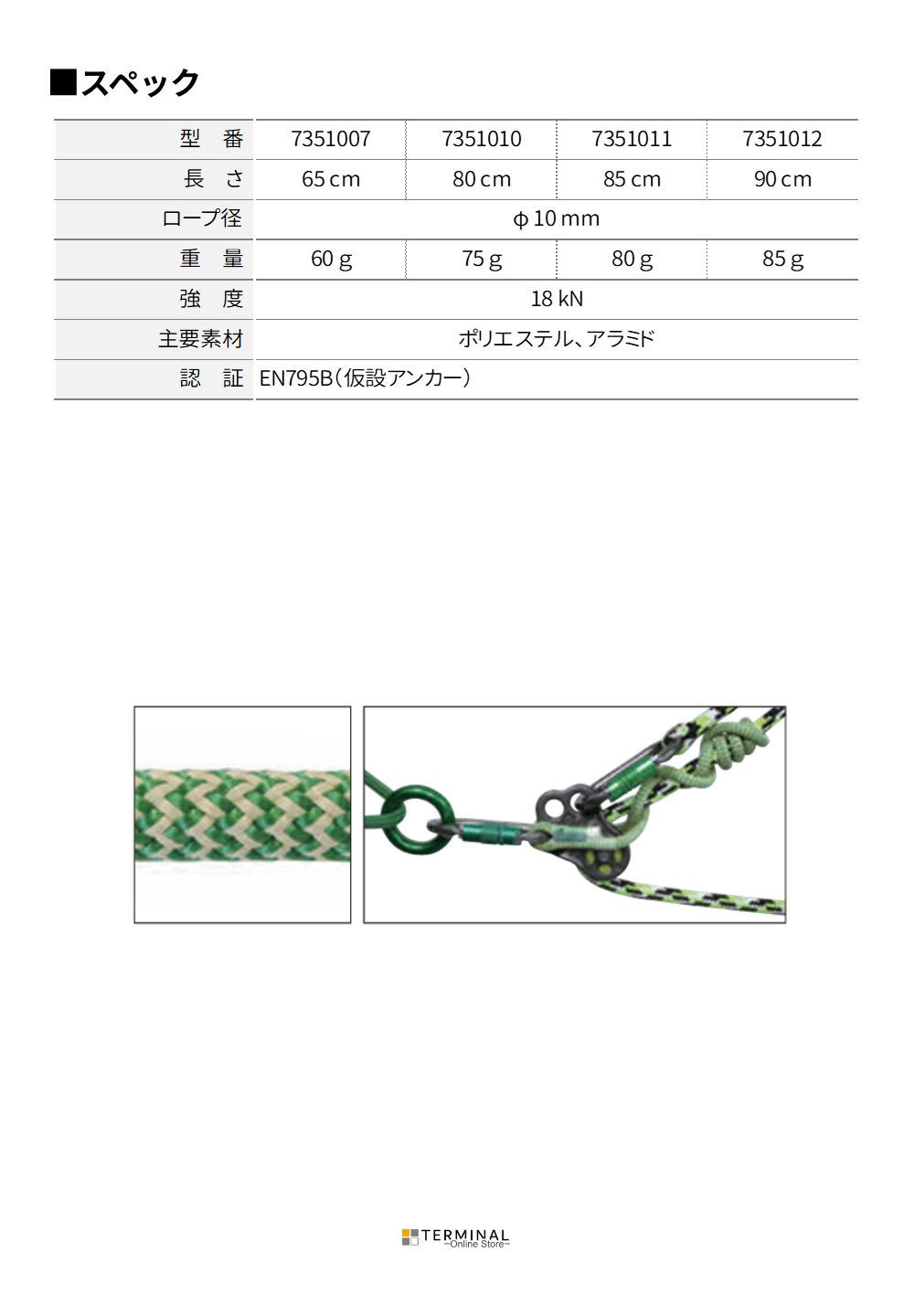・「8 mm 76 cm」は、ワークポジショニングランヤード「ヒップスターフレックスライト 11.5 mm」専用のプルージックコードで、圧縮スリーブは片側のみとなっています。
