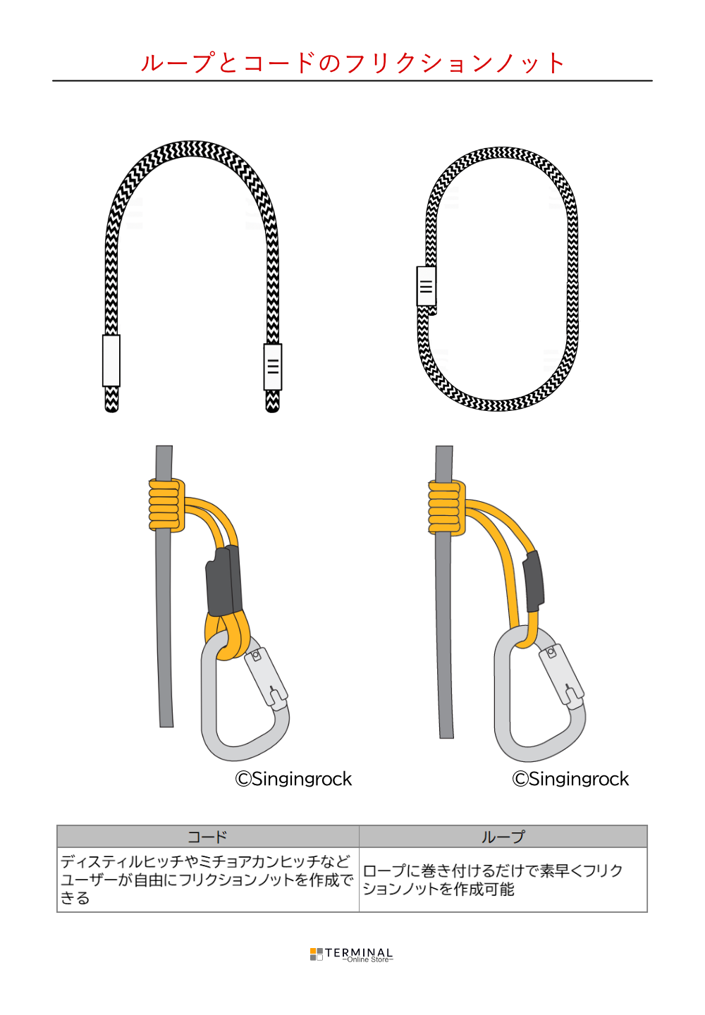・「8 mm 76 cm」は、ワークポジショニングランヤード「ヒップスターフレックスライト 11.5 mm」専用のプルージックコードで、圧縮スリーブは片側のみとなっています。