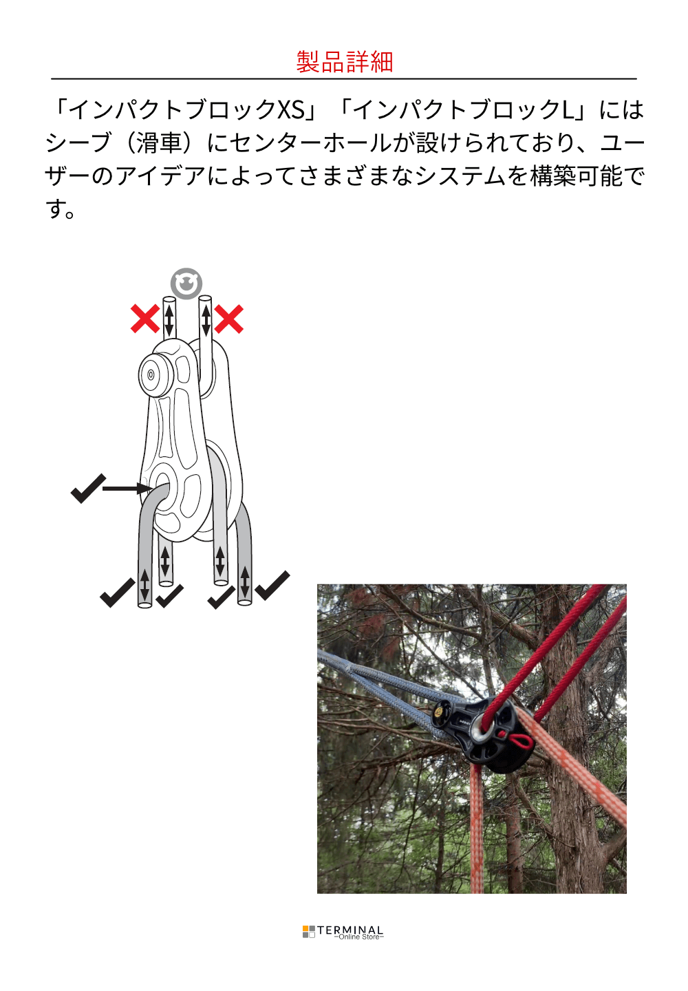 高負荷による耐衝撃性に優れたインパクトブロックのMBSはSで200kN、L で300kNという信じがたい強度を誇ります。高品質素材、高度な製造プロ セスの組み合わせにより、繊維製品へのダメージを最小限に抑えられます。 ツリーワーク、インダストリー、レスキューなど、あらゆる場面で想定されるリギングシーンにおいて史上最強のプーリーと言えます。