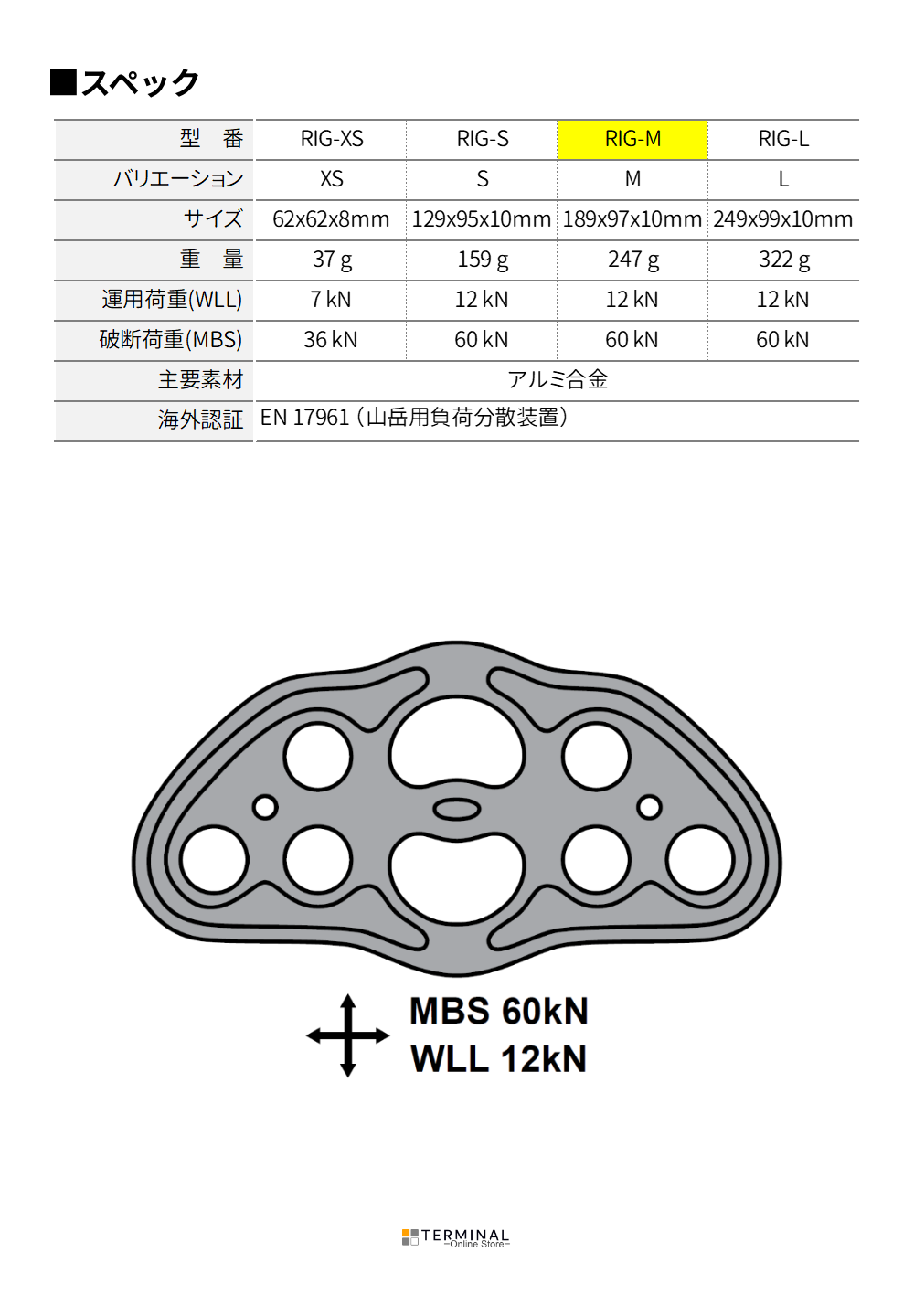 複数アンカーを可能にする支点作成に不可欠なリギングプレート。 XS〜Lまでのサイズがあり、S〜Lまでは溝打ちされ、捩れに強い構 造です。