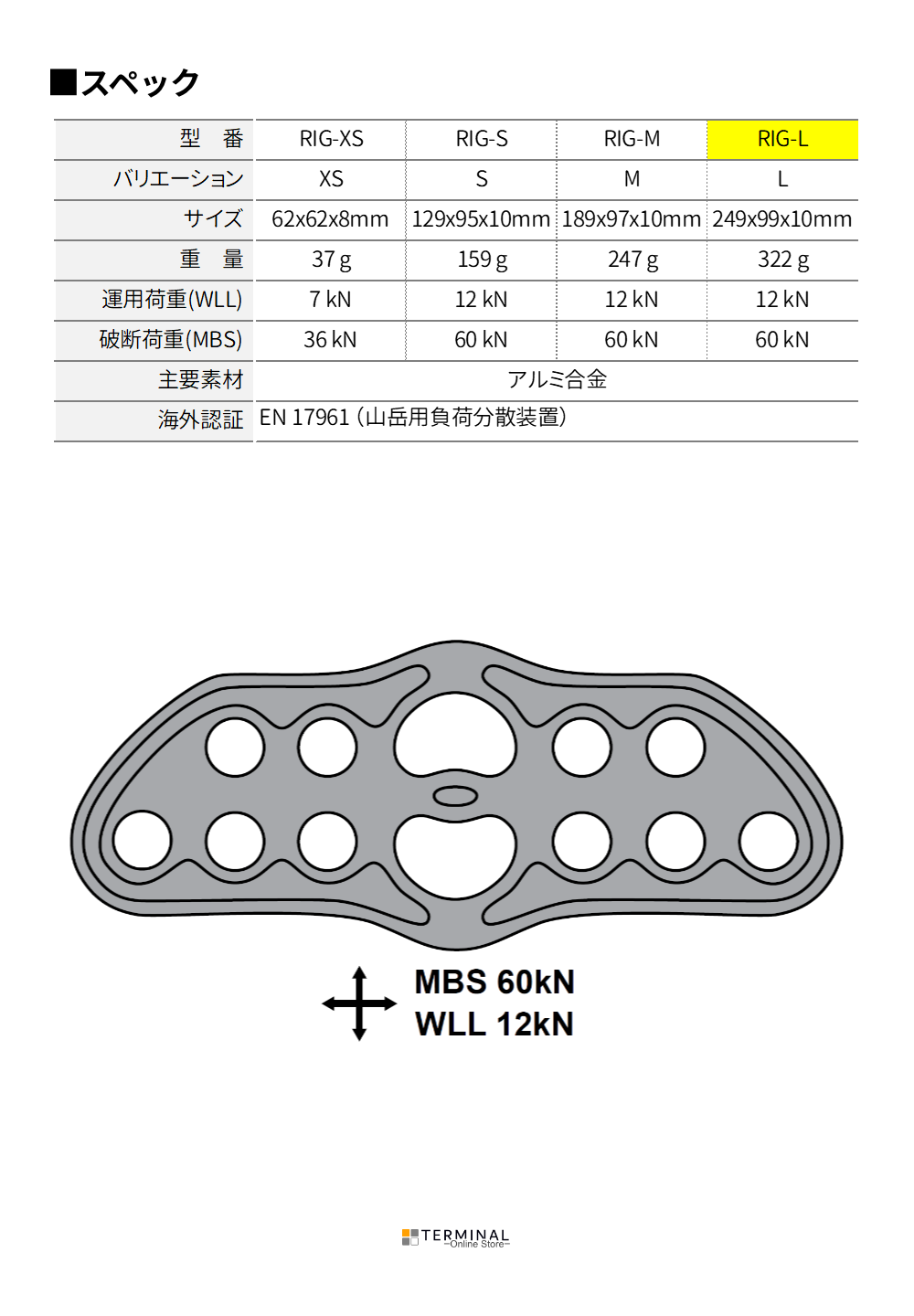 複数アンカーを可能にする支点作成に不可欠なリギングプレート。 XS〜Lまでのサイズがあり、S〜Lまでは溝打ちされ、捩れに強い構 造です。
