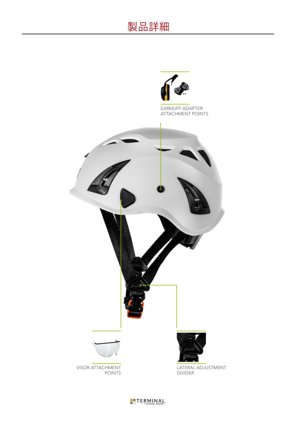 EN 397 に準拠したクイック リリース留め具と開口部を備えた 4 点のあごストラップ。ストラップの長さを調整するための横方向の仕切りが付いています。