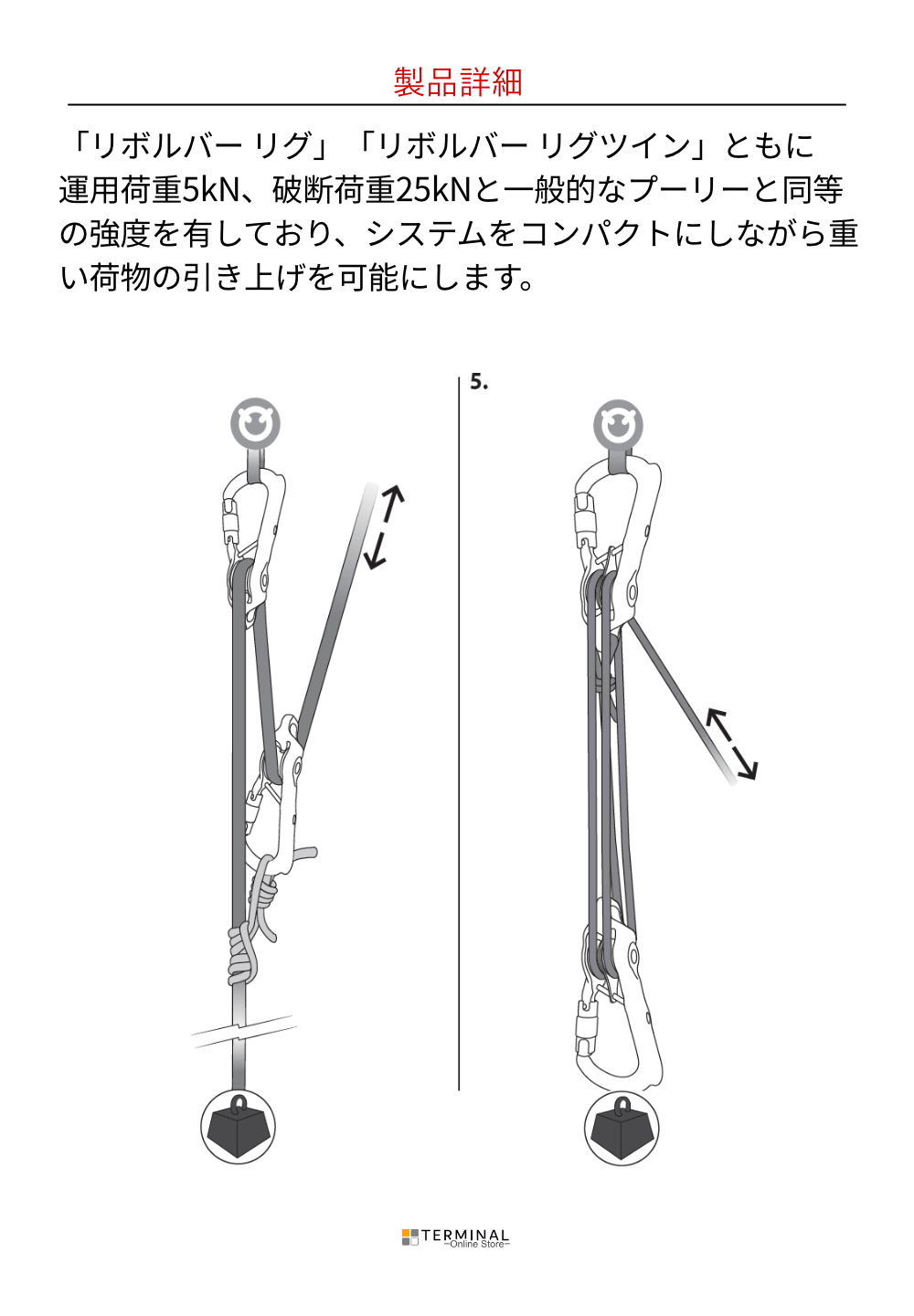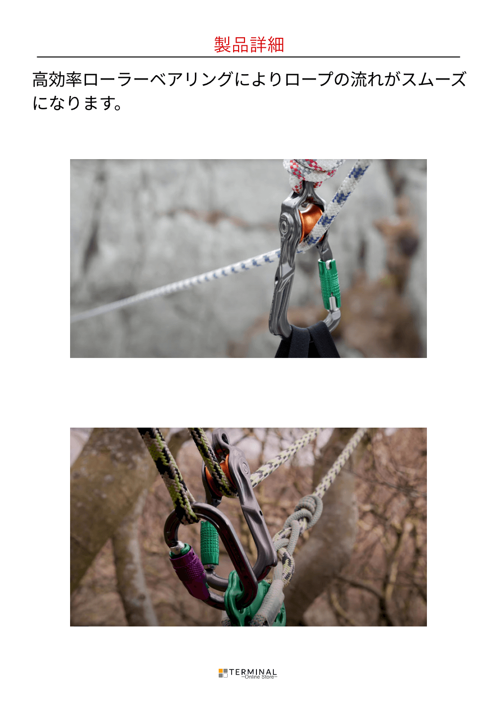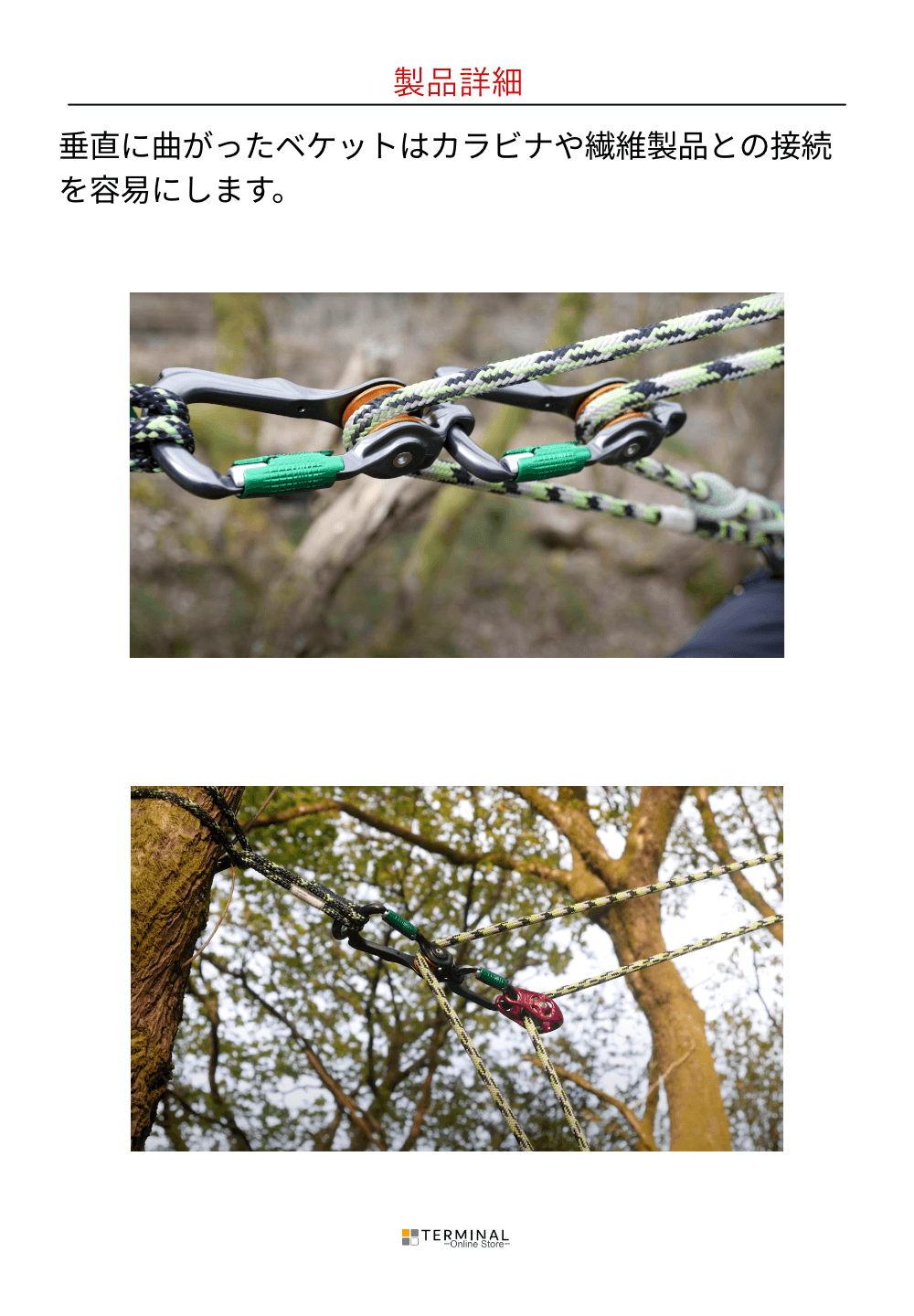 リボルバーリグとリグツインは革新的なプ ーリーホイールコネクターです。プーリー とカラビナの要素を一体化することで高い効率性と汎用性を生み出し、かつ携行する必要のあるデバイスを最小限に抑えるこ とができます。垂直に曲げたベケットはカ ラビナや繊維製品との接続を容易にします。