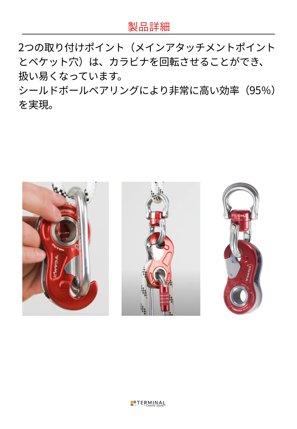 Turbolockは、非常にコンパクトで堅牢かつ効率的に設計されたセルフジャミングプーリーです。片手で操作できるように特別にデザインされています。開閉用のロック機構により、アンカーから本体を外さずにロープを取り付けることができ、プーリーに荷重がかかったときは本体を開くことができないため、使用中の誤開放を防ぐことができます。歯付きカムは、8?13mmのロープをすばやく強力にロックように設計されています。カムは、偶発的な作動を防ぐためにフランジの内側で保護されているスイッチで切り替えます。ロープの容易な着脱のため、またはデバイスをロックしない単純な滑車として使用するためのアクションは1つのみです。カムを有効にするためのアクションは2つです。2つの取り付けポイント(メイン取り付けポイントとベケット穴)は、カラビナを回転させることができ、扱い易くなっています。シールドボールベアリングにより非常に高い効率(95%)を実現。頑丈な構造は、熱間鍛造サイドプレート、精密に削られたアルミニウム合金シーブ(索輪)、ステンレス鋼のカム、リベット、ピンを備えています。