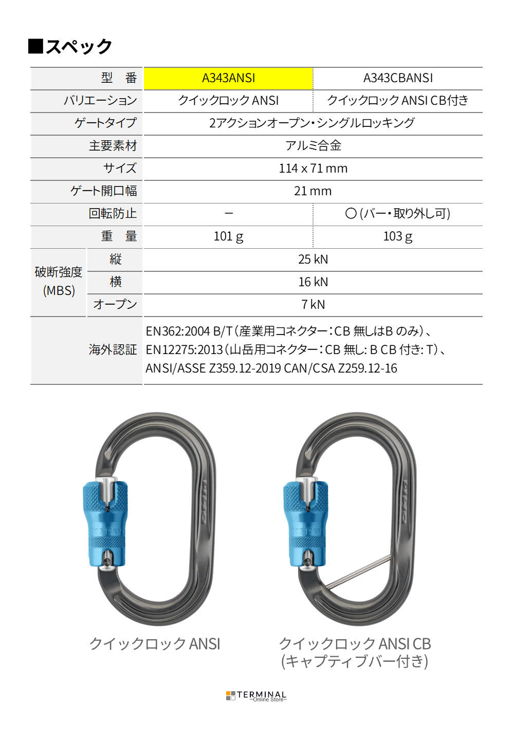 クイックロック ANSI CB付き | 103 g | 21 mm | 25 kN | 16 kN | 7 kN |