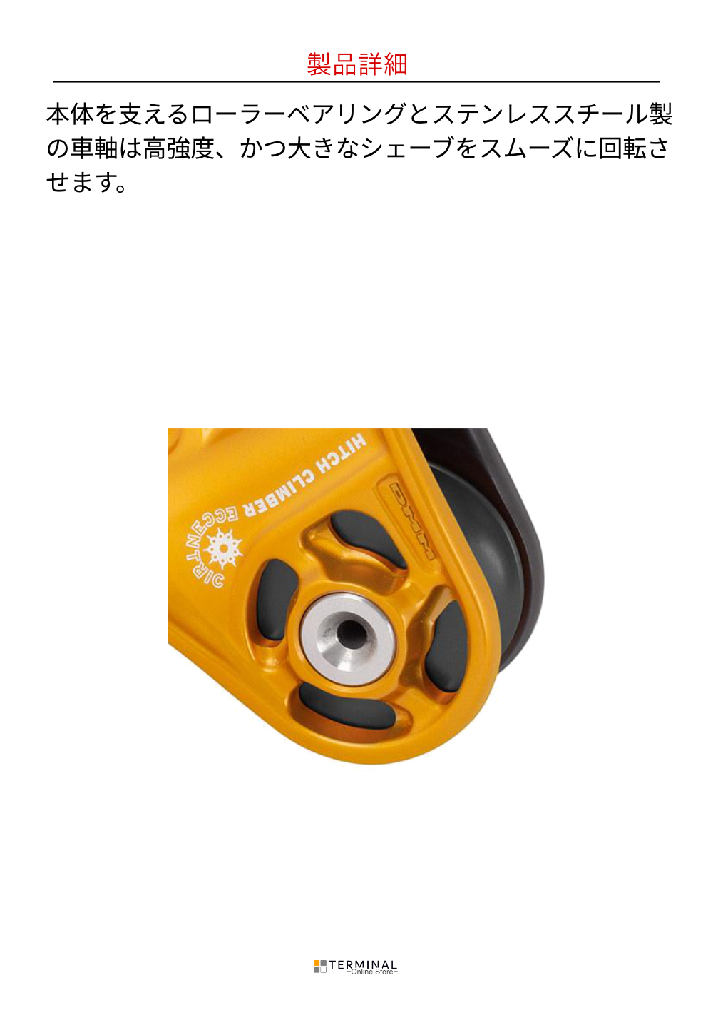 “ヒッチクライマー”として広く知られるようになったトリプルアタッチメントプーリーの進化版です。幾何学的な形状は高い効率を提供し、ワイドに展開した“プッシングプレート”はフリ クションヒッチを最適化させるとともに、ロープへのダメージを最小限に抑えます。また、本体を支えるローラーベアリン グとステンレススチールアクスルは高強度、かつ大きなシェー ブをスムーズに回転させます。