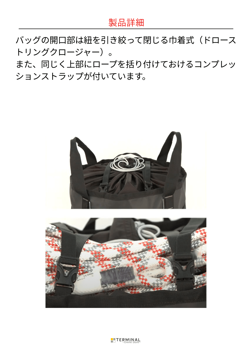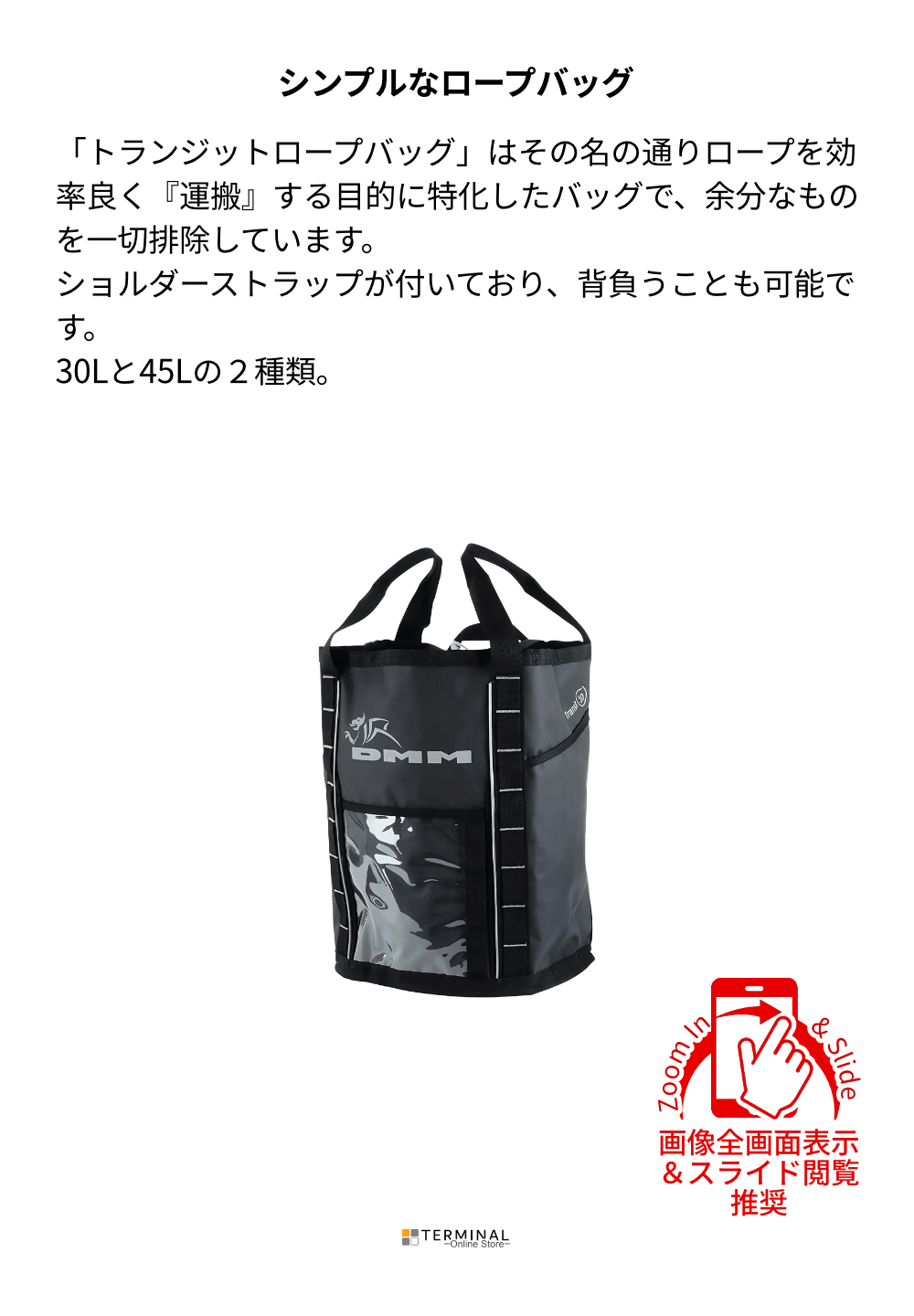 トランジットロープバッグはその名の通りロープを効率良く『運搬』 するために余分なものを一切排除しています。ショルダーストラッ プが付いており、背負うことも可能です。