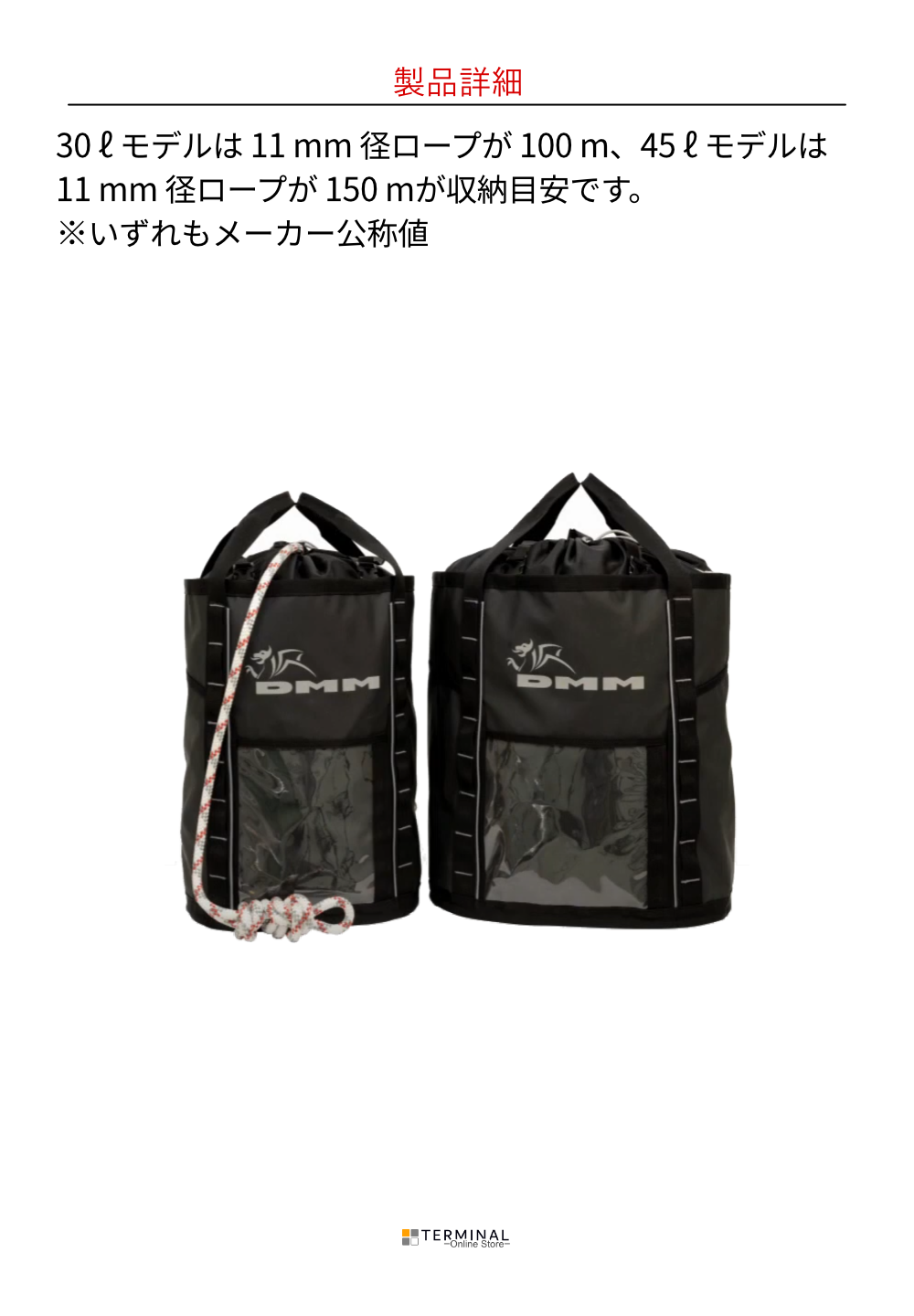 〈ロープ収納の目安〉 30?= 11mm×100m 45?= 11mm×150m