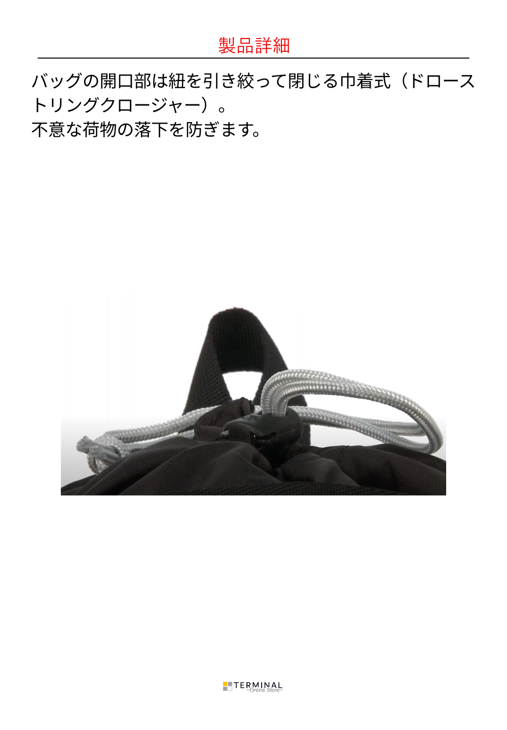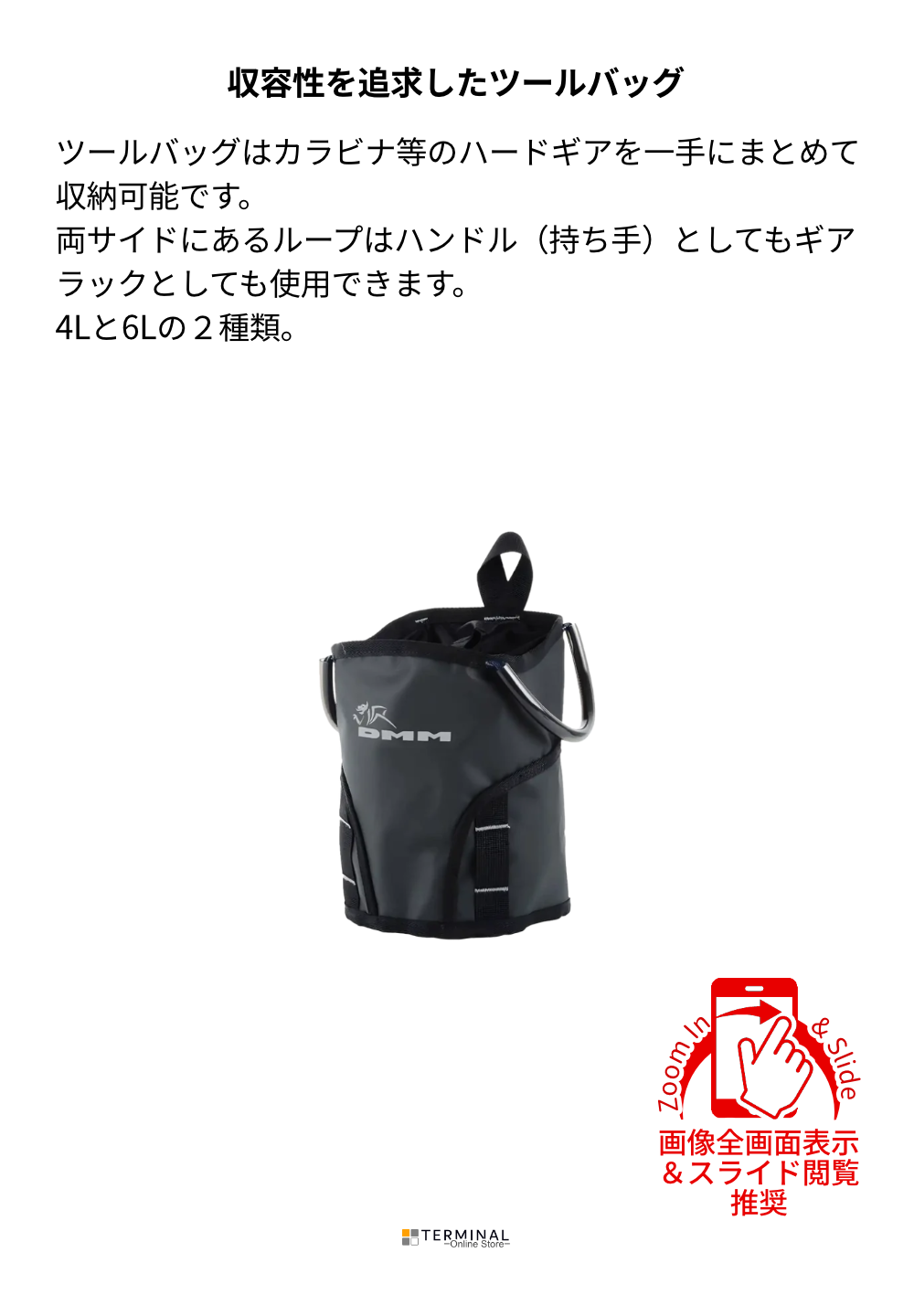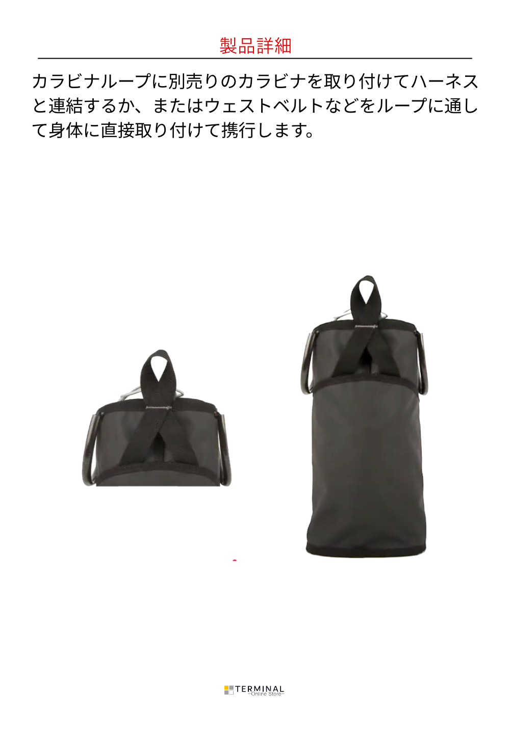 ツールバッグはカラビナ等のハードギアを一手にまとめて収納可能です。両サイドにあるループはギアラックとハンドキャリーを兼 用しています。